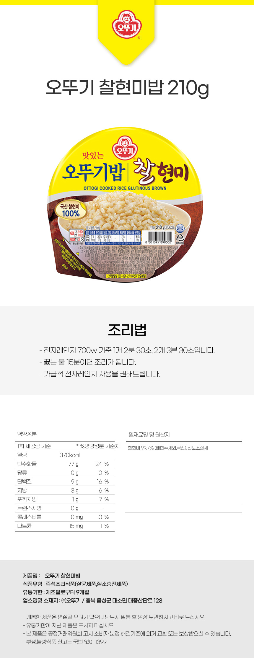 오늘저녁뭐먹지 오뚜기 찰현미밥 210g상품상세_동원몰