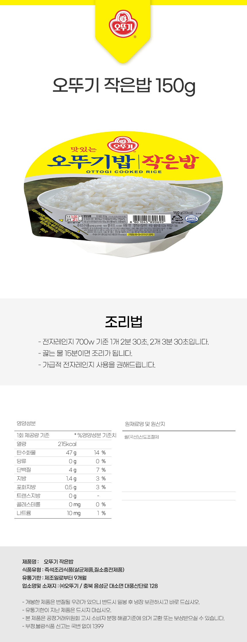 오늘저녁뭐먹지 오뚜기 작은밥 150g상품상세_동원몰