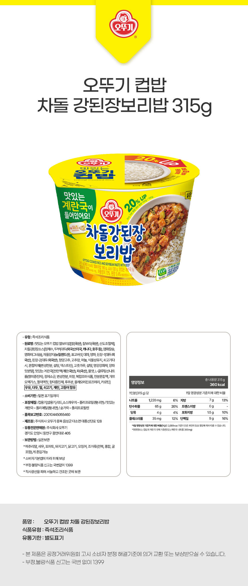 오늘저녁뭐먹지 오뚜기 컵밥 차돌 강된장보리밥 310g상품상세_동원몰