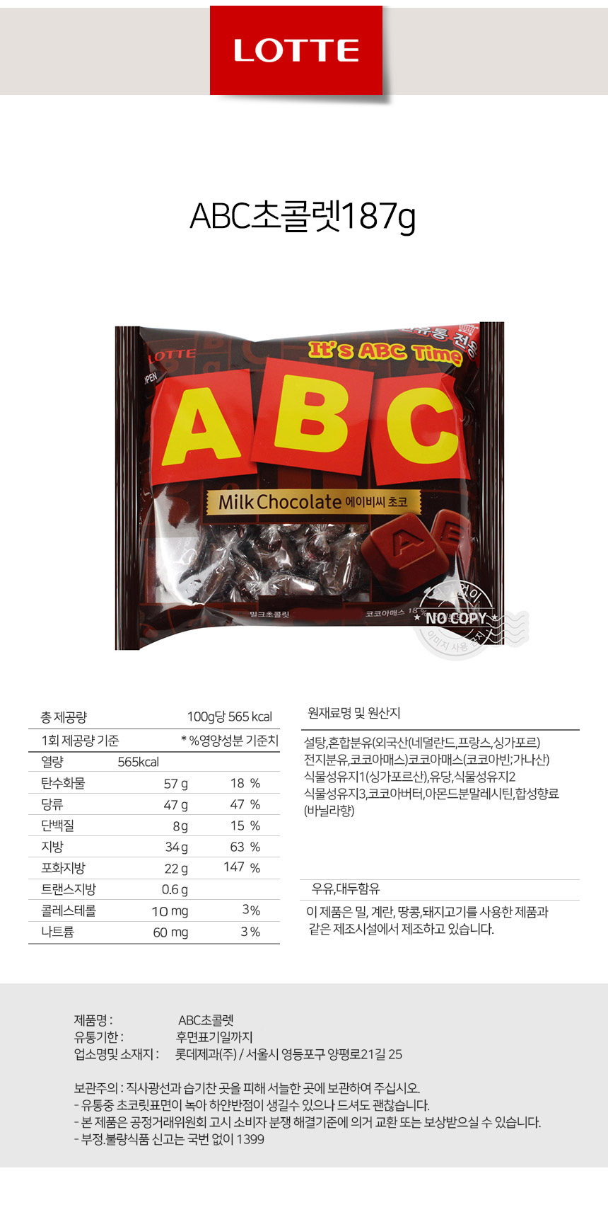 당충전 달달간식 롯데 ABC 초콜렛 187g상품상세_동원몰