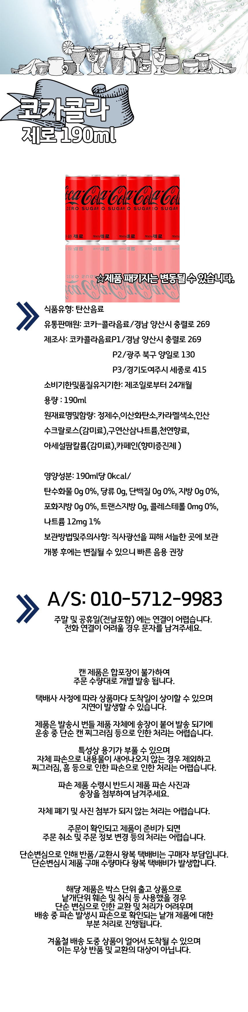 | 포장단위별 내용물의 용량(중량),수량 | 코카콜라 제로 190ml |