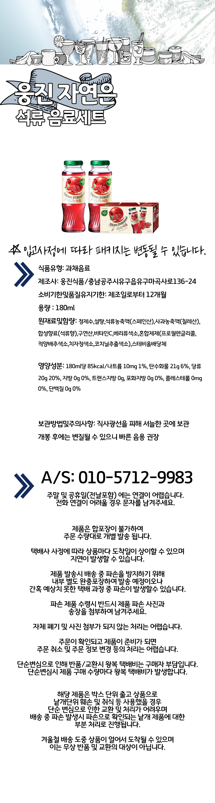 | 원재료 및 함량 | 정제수,설탕,석류농축액(스페인산),사과농축액(칠레산),합성향료(석류향),구연산,비타민C,베리류색소,혼합제제(프로필렌글리콜,적양배추색소,치자청색소,코치닐추출색소),스테비올배당체 |