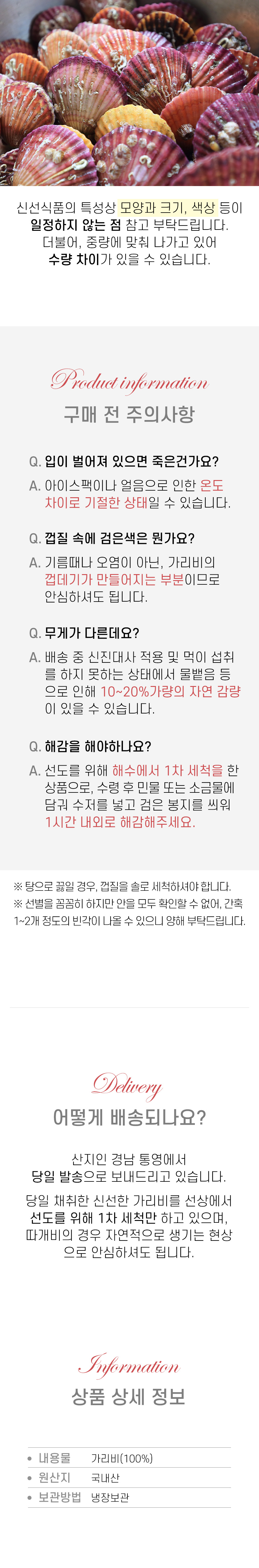 | 포장단위별 내용물의 용량(중량),수량,크기 | 국내산 가리비 1kg x1, 크기는 상품별 차이가 있어 정보제공이 어렵습니다. |