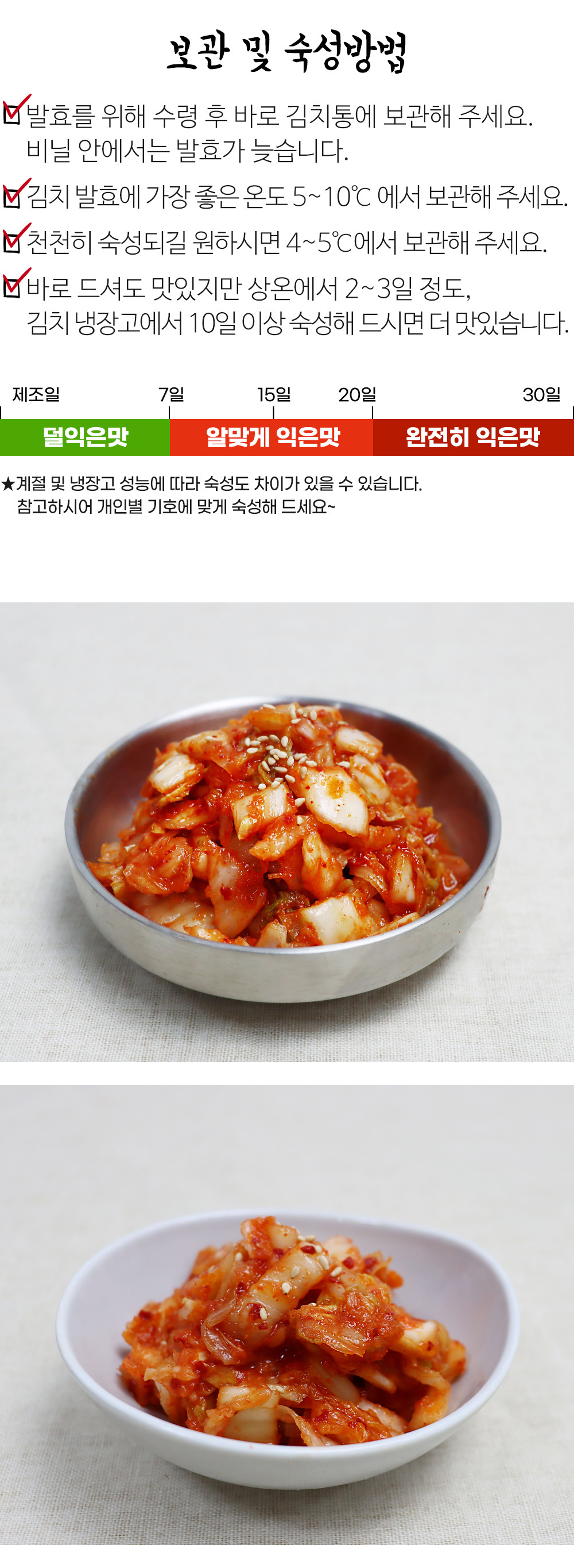 김치는 주문 후 바로 생산하며, 김치의 신선도를 위하여 휴일 전날에는 생산지시 및 배송 지시를 내리지 않습니다.(휴일이 속해있는 배송은 일반배송 소요일보다 1~2일 추가 소요됩니다.)