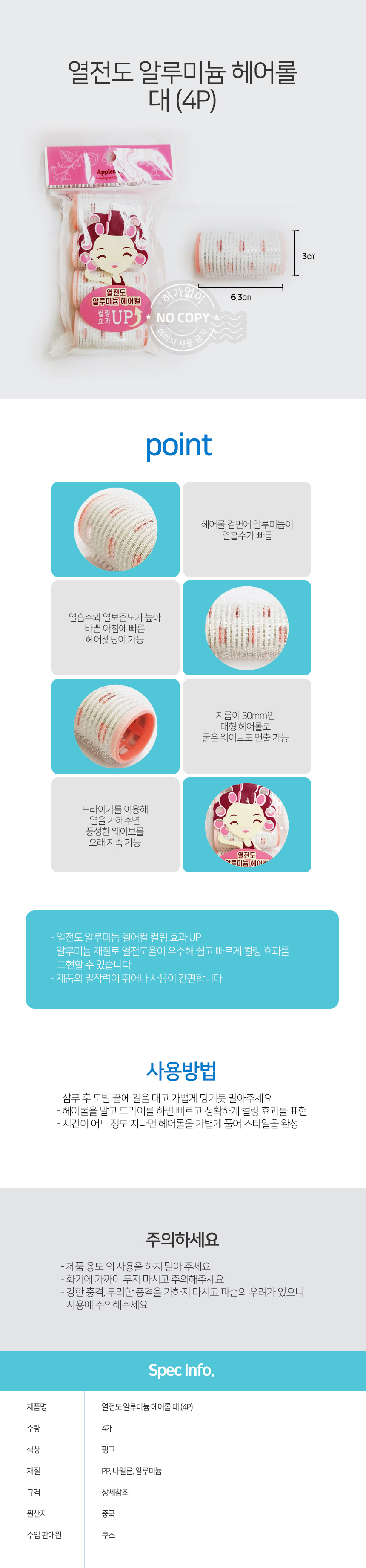 자연앤톡 알루미늄 헤어컬 4P 헤어롤 앞머리 홈아트 대 쿠소 열전도상품상세_동원몰