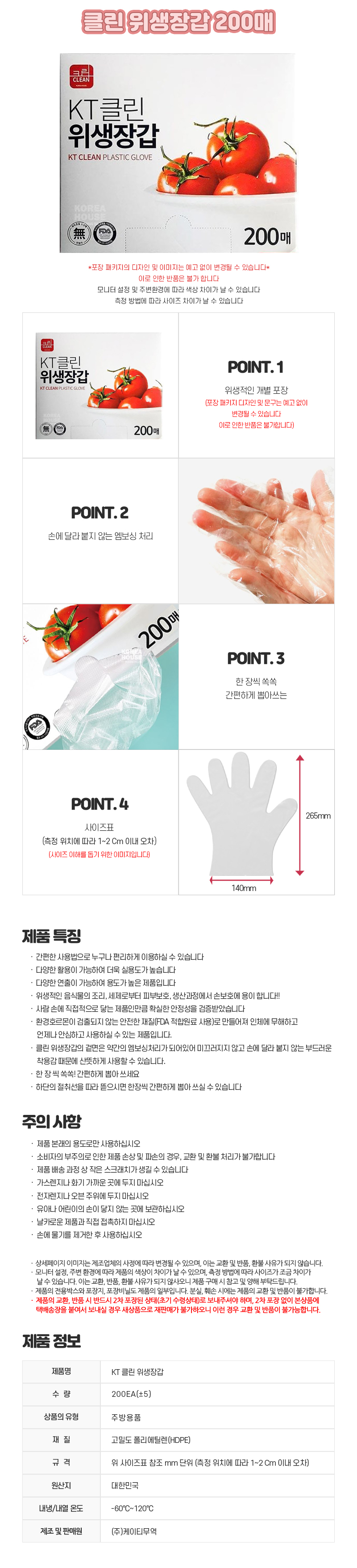 자연앤톡 위생장갑 비닐장갑 음식물 클린 200매 무침상품상세_동원몰