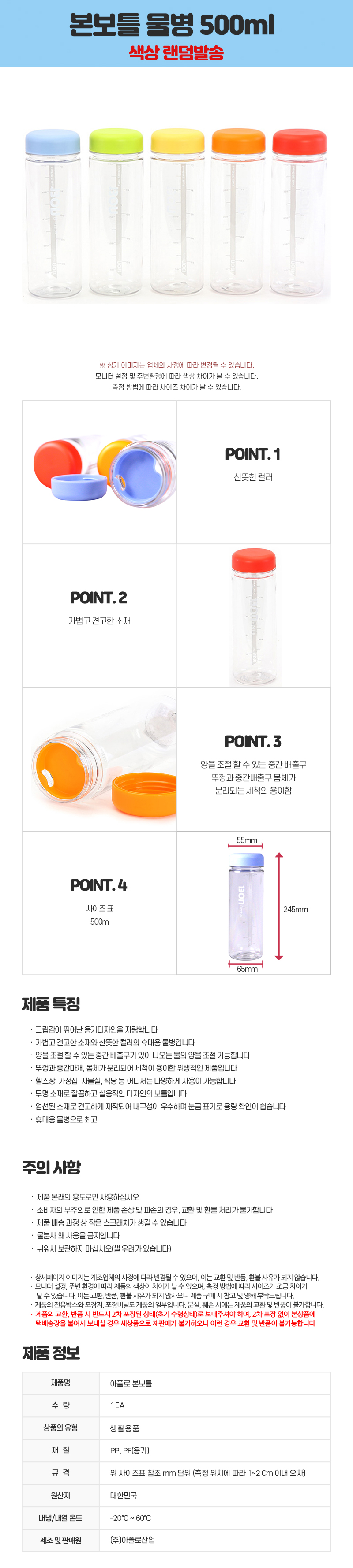 자연앤톡 휴대 물병 PET 아폴로 500ml 본보틀 색상랜덤 용기상품상세_동원몰