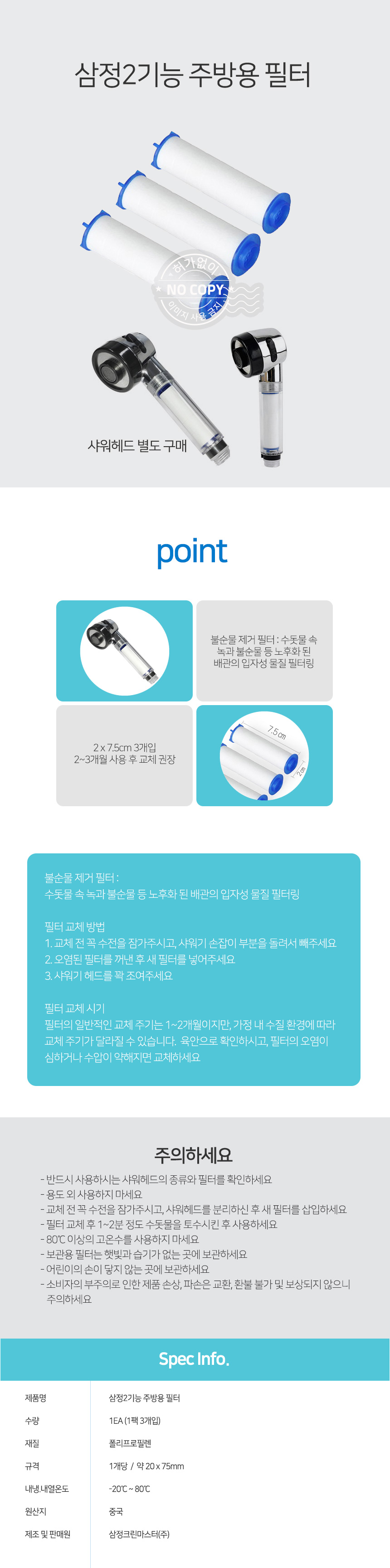 자연앤톡 필터 호스 주방용 교체용 3개입 샤워헤드 2기능상품상세_동원몰