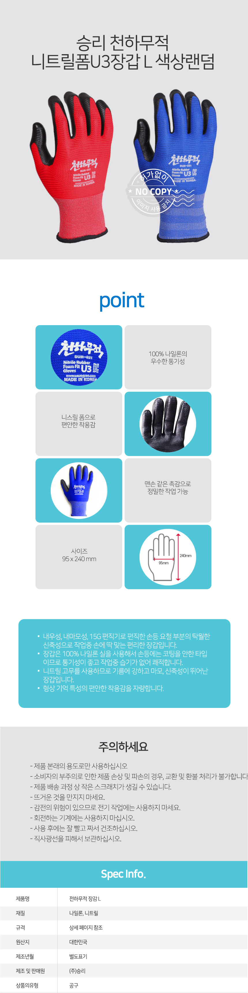 자연앤톡 색상랜덤 니트릴폼 코팅장갑 승리 U3장갑 천하무적 L상품상세_동원몰