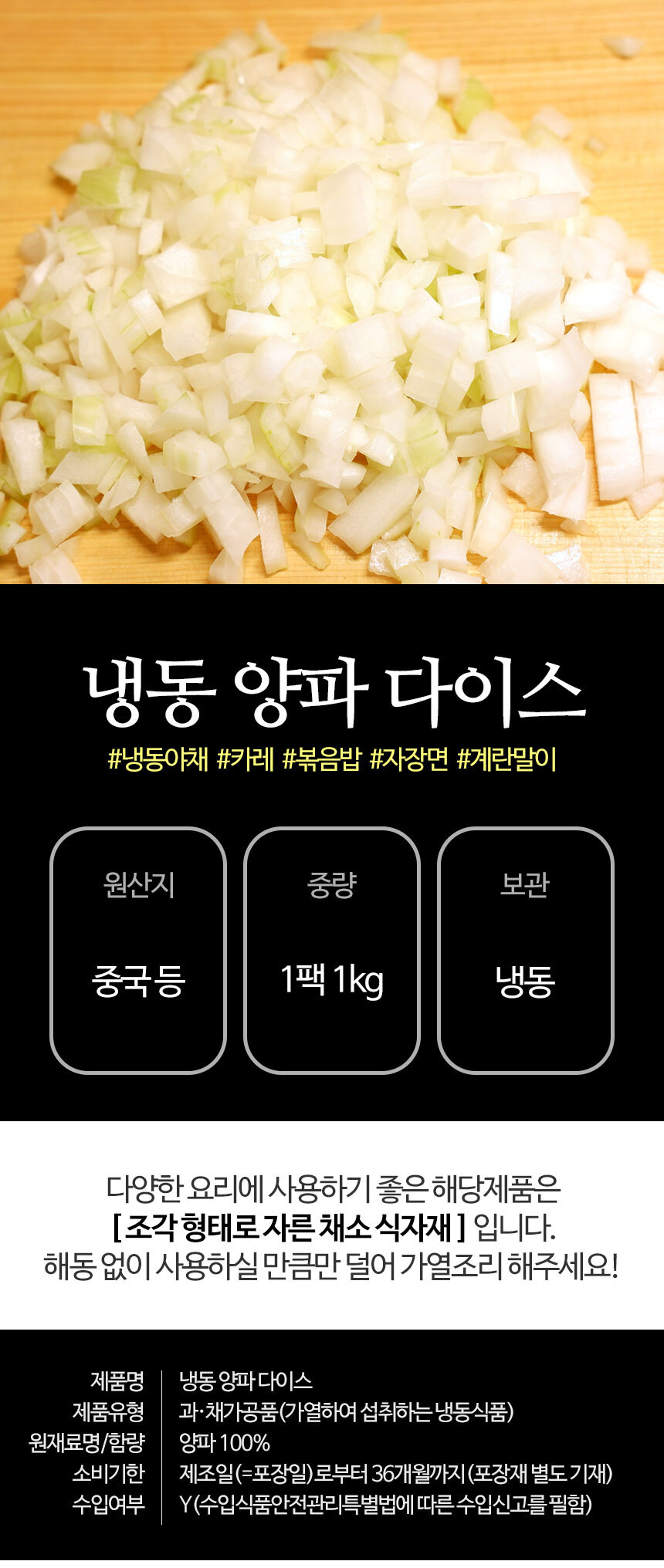 | 상품구성 | 냉동 양파(다이스) 1kg 1팩 |