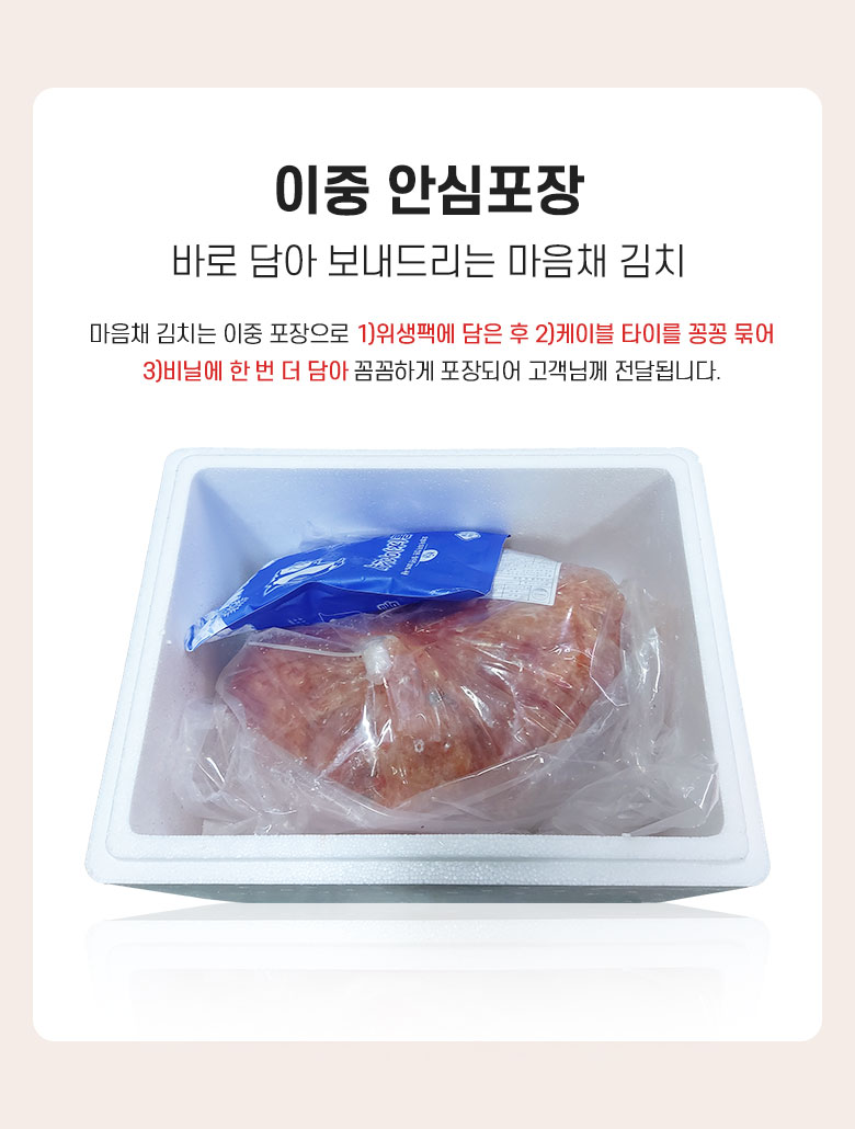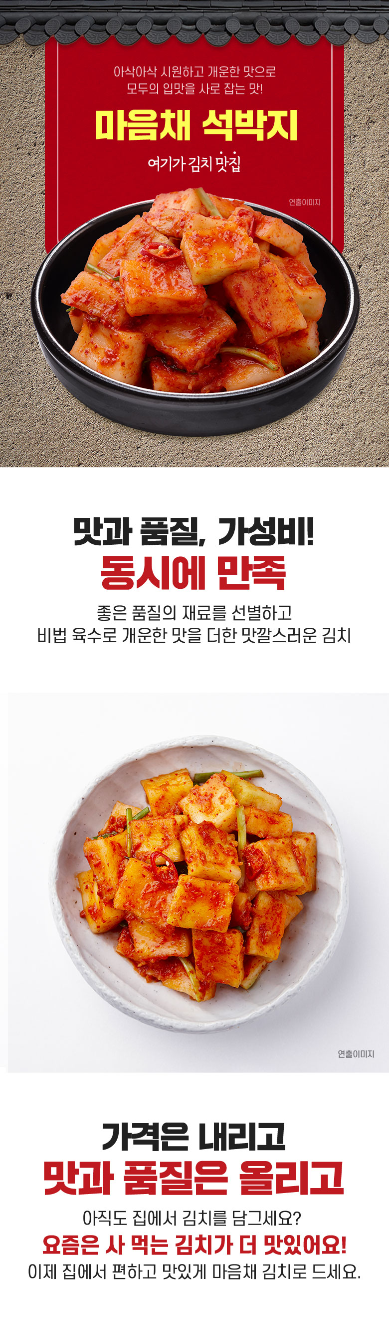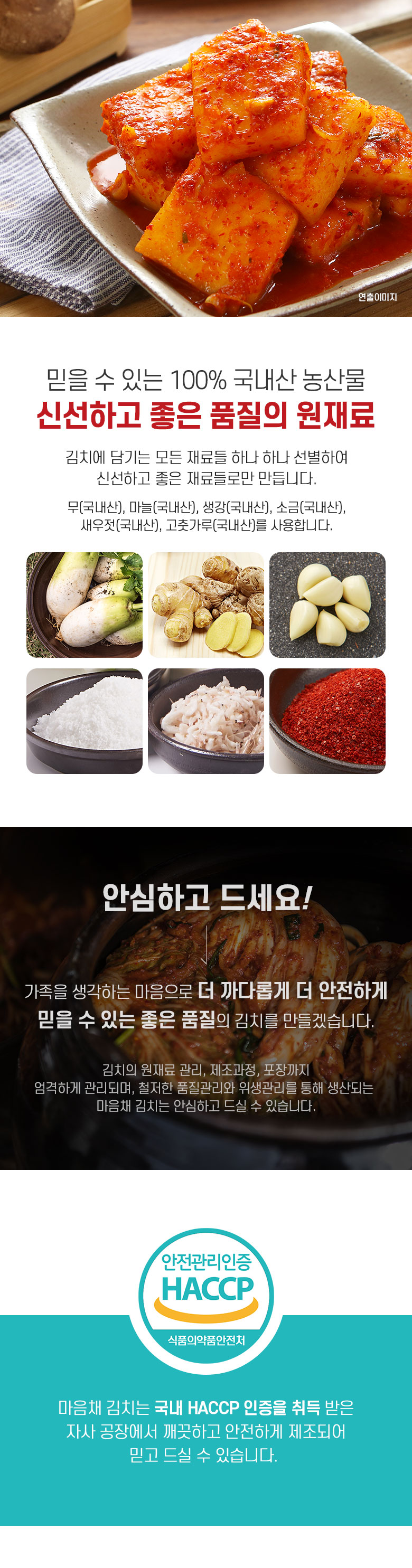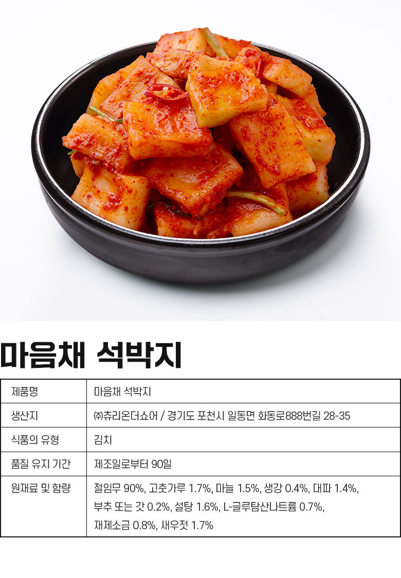 | 원재료 및 함량 | 절임무 90%,고축가루1.7%,마늘1.5%,생강0.4%,대파1.4%, 부추 또는 갓0.2%,설탕1.6%L-글루탐산나트륨0.7%,재제소금0.8%,새우젓1.7% |