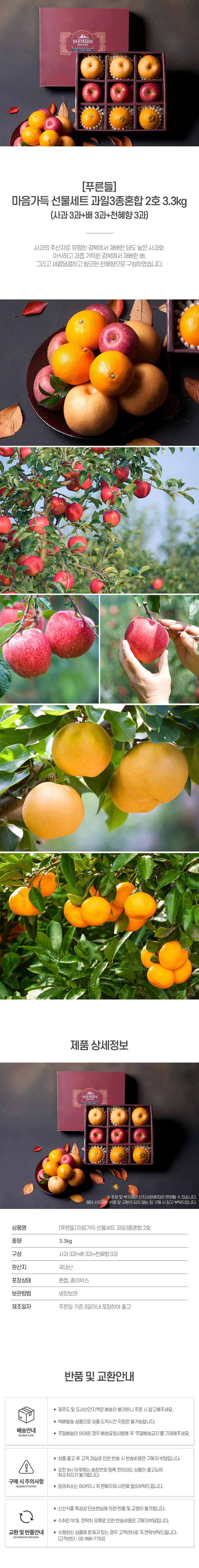 | 상품구성 | 총 3.3kg [사과+배+천혜향 각3과] |