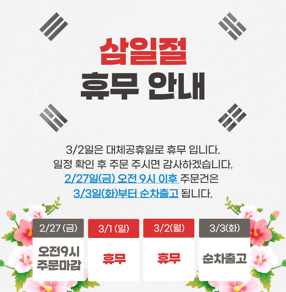 | 휴일(2) | 일반상품 단독 | 오전주문 | 휴무일 | 제품수령 | |||
