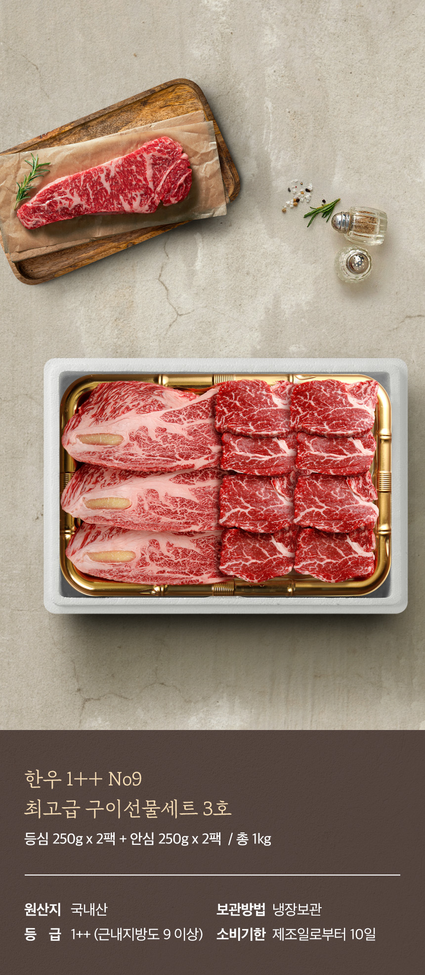 | 포장단위별 내용물의 용량(중량),수량,크기 | 1++ 9 열성형 채반(등심250gx2+안심250gx2)총 1kg, 크기는 상품별 차이가 있어 정보제공이 어렵습니다. |