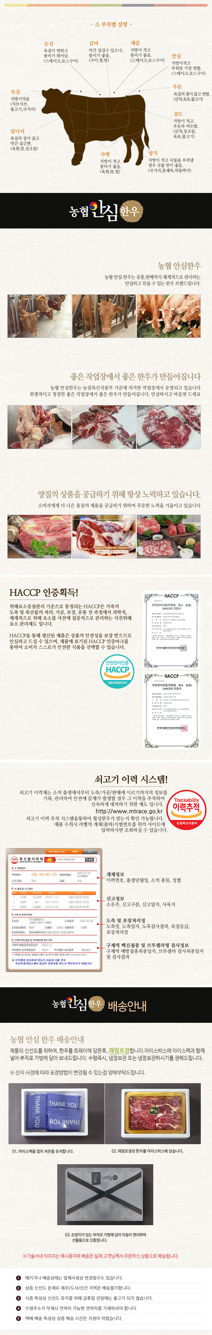 | 관련법상 표시사항 | 축산법에 따른 등급 표시 / 쇠고기 이력 추적시스템 / HACCP 인증/이력번호 표시제품으로 수령하는 고객님들이 직접 이력번호를 확인할 수 있음 |