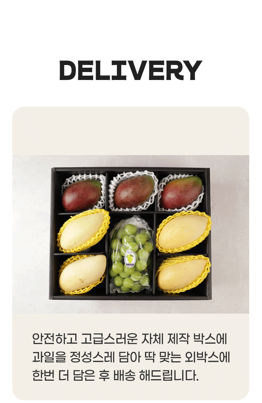 | 원산지 | 망고/태국/100%, 애플망고/페루/100%, 샤인머스캣/국내산/100% |