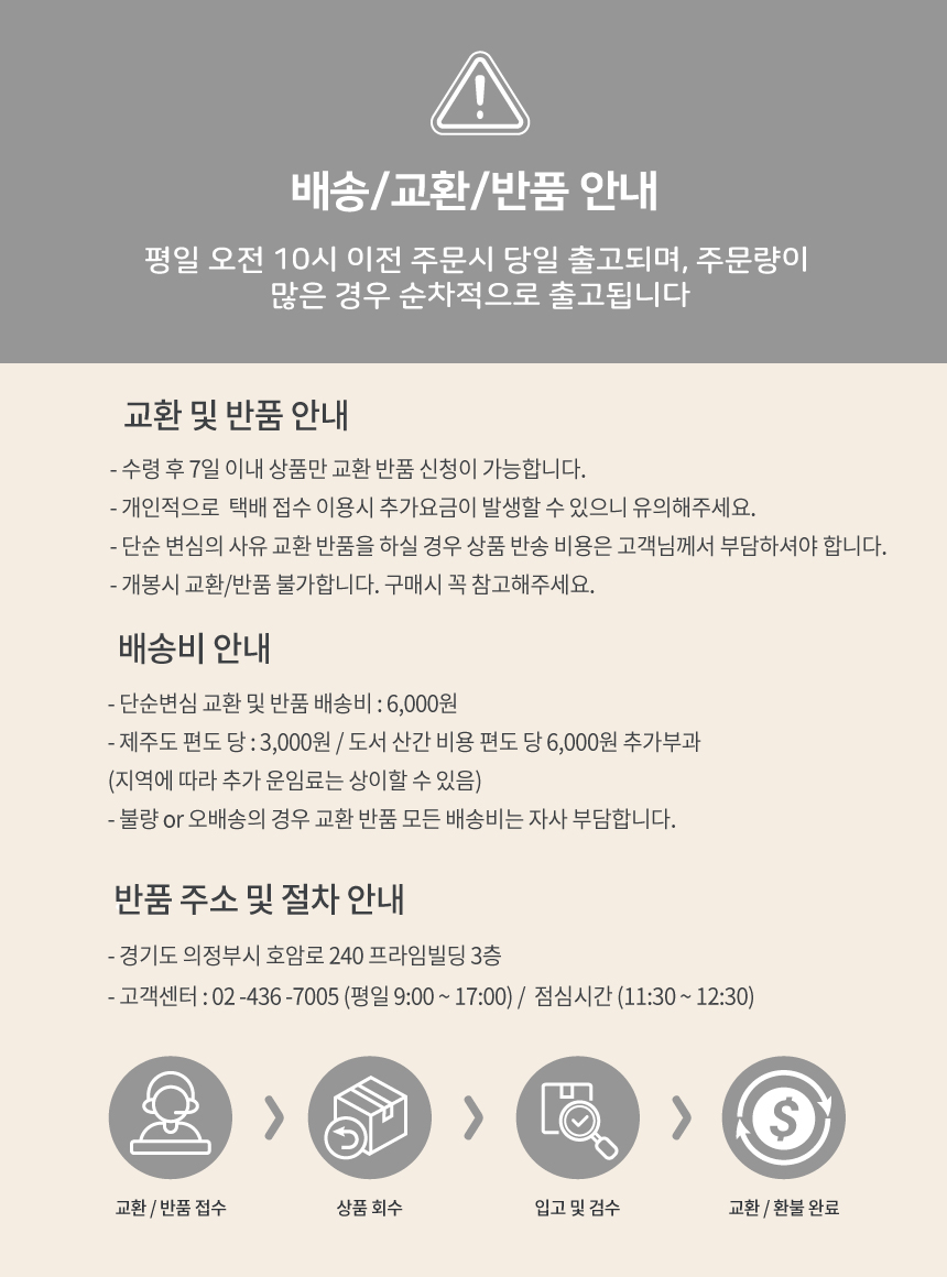 위의 배송기간은 표준 배송 기간이며 재고의 유무, 배송지역, 택배사 사정에 따라 배송기간이 추가 소요될 수 있습니다.