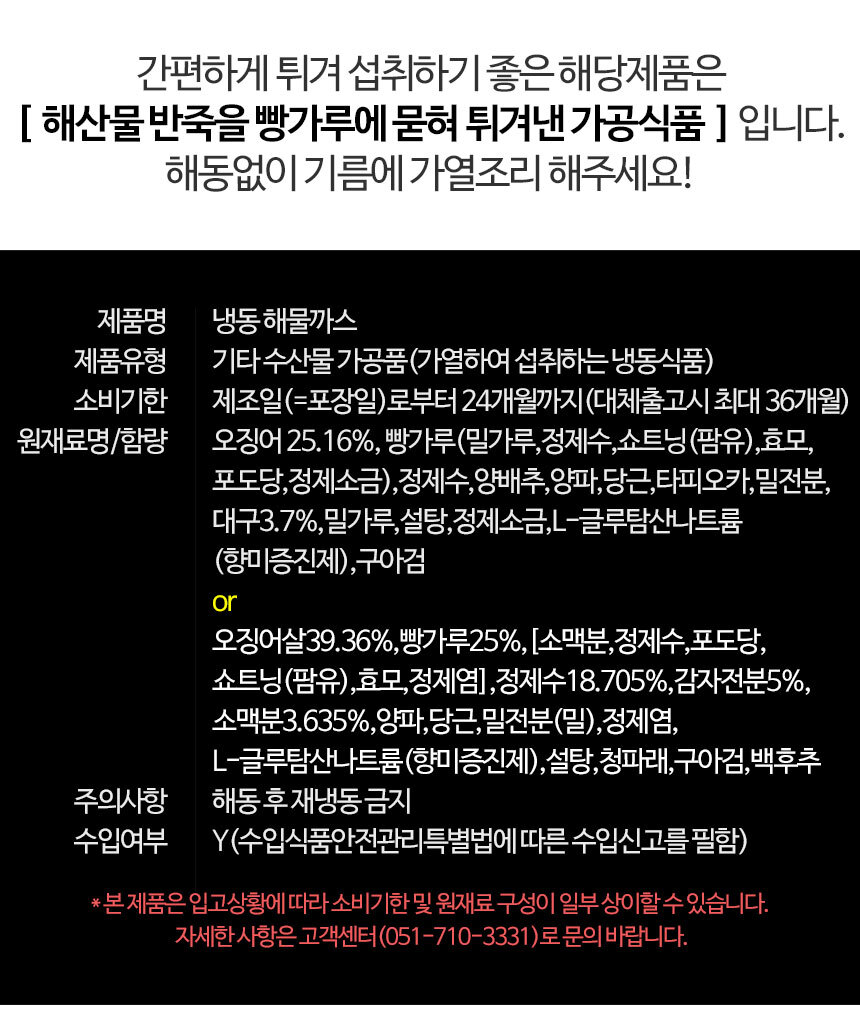 | 소비자안전을 위한 주의사항 | 이미 냉동된 바 있으니 해동 후 재냉동 금지 |