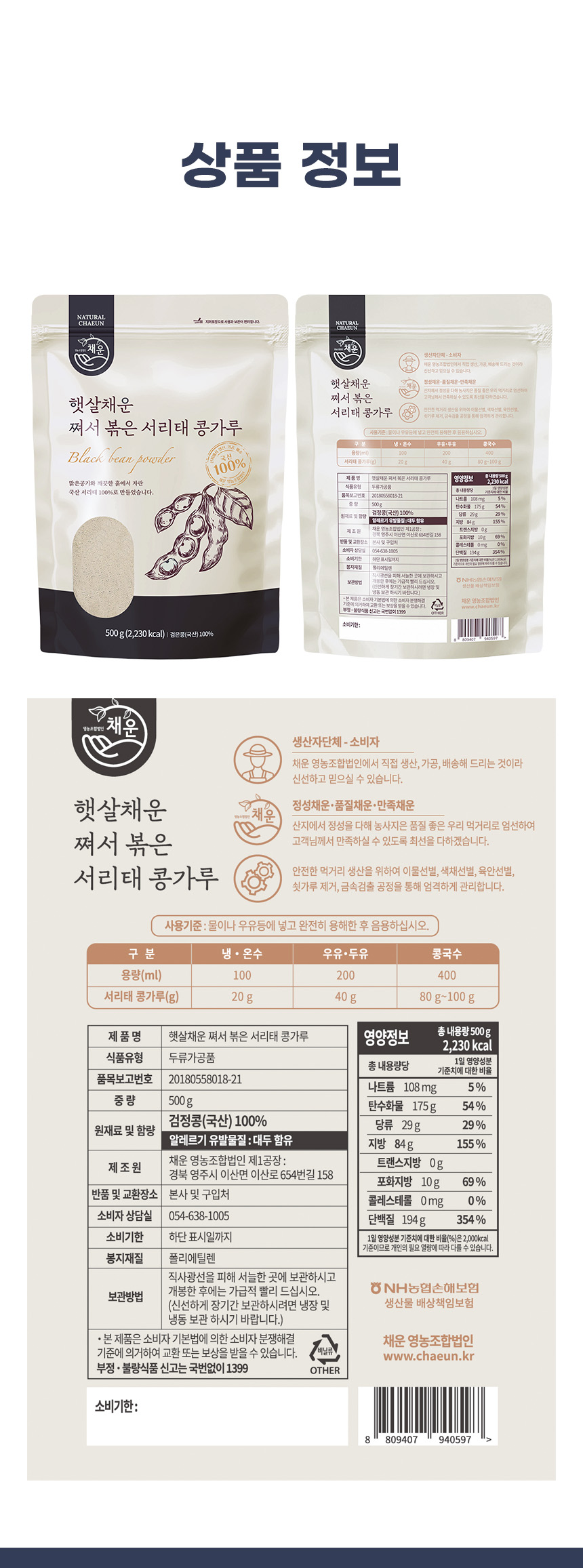 | 포장단위별 내용물의 용량(중량),수량 | 볶은 검은콩가루 500g, 중량으로 표기되는 상품은 크기를 기재할 수 없음 |