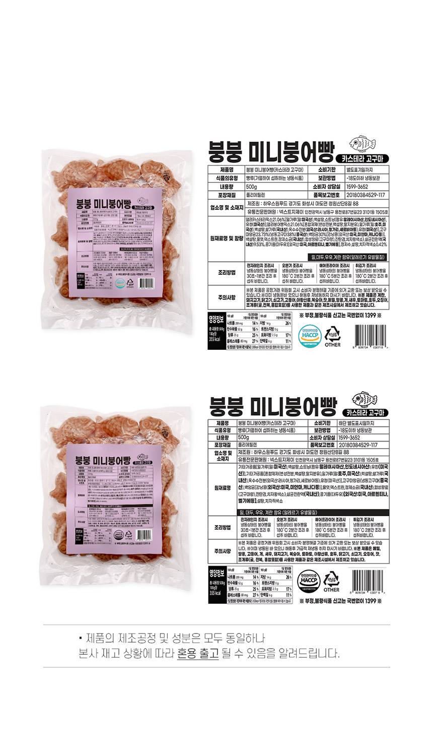 | 포장단위별 내용물의 용량(중량),수량 | 붕붕 고구마 미니 붕어빵 500g x 2팩 |