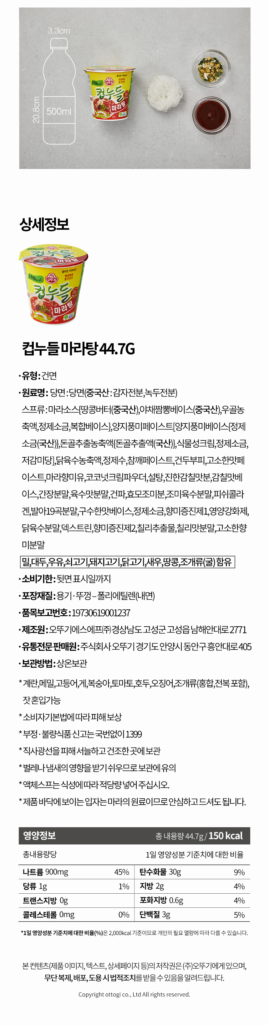 | 포장단위별 내용물의 용량(중량),수량 | [오뚜기] 컵누들 마라탕 (컵) 44.7g,6개,중량으로 표기되는 상품은 크기를 기재할 수 없음 |