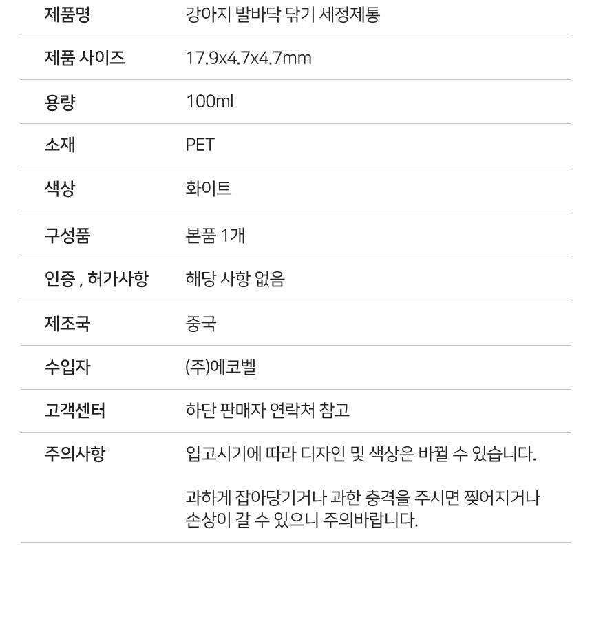 | 품명 및 모델명 | 강아지 발바닥 닦기 세정제통 / ECLIANBE04 |