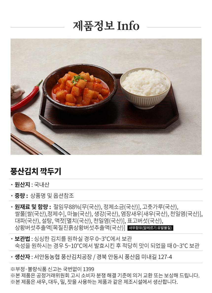 | 생산자 및 소재지/수입자 | 서안동농협 풍산김치공장 / 경북 안동시 풍산읍 미내길 127-4 |