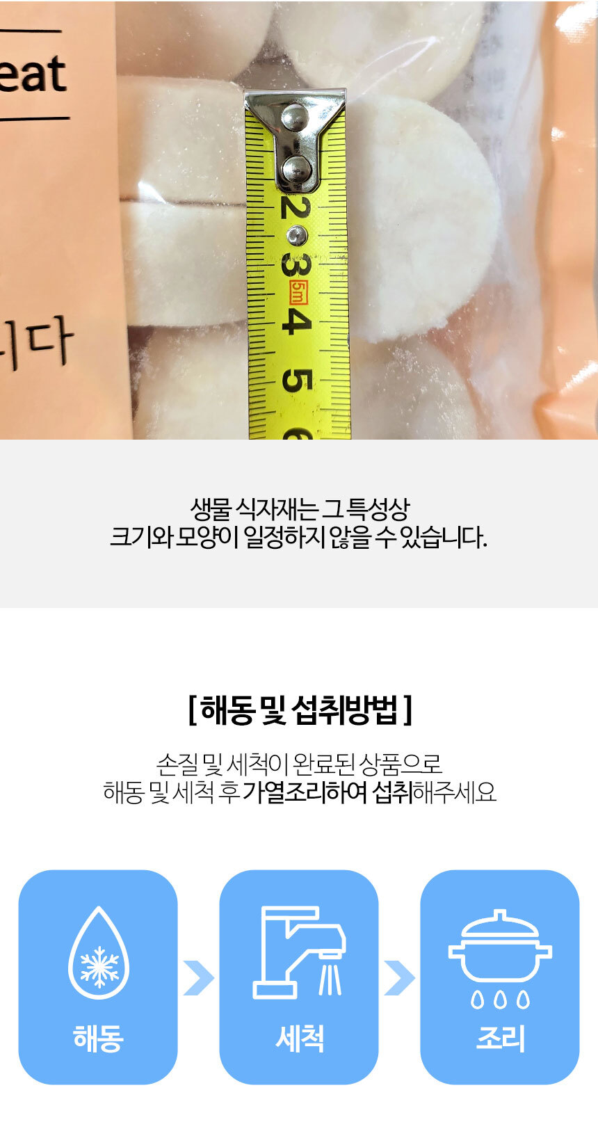 | 식품 등의 표시,광고에 관한 법뮬에 따른 소비자 안전을 위한 주의사항 | 이미 냉동된 바 있으므로 해동 후 재냉동 금지 |