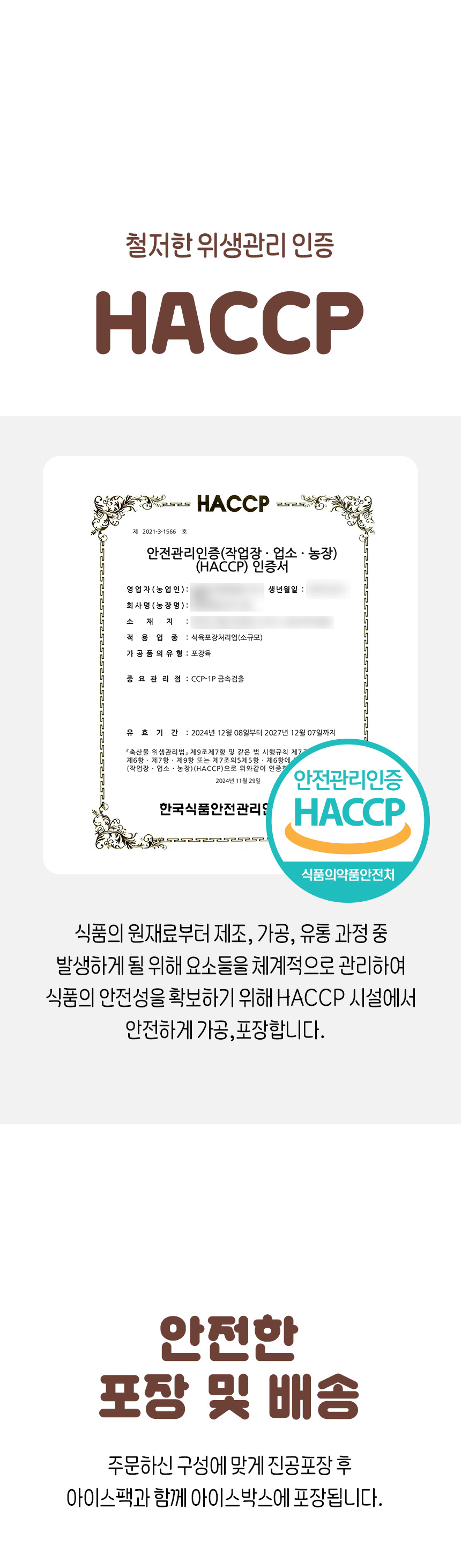 | 관련법상 표시사항 | 수입식품안전관리특별법에 따른 수입신고를 필함(축산물이력제 표시제품) /이력번호 표시제품으로 수령하는 고객님들이 직접 이력번호를 확인할 수 있음 |