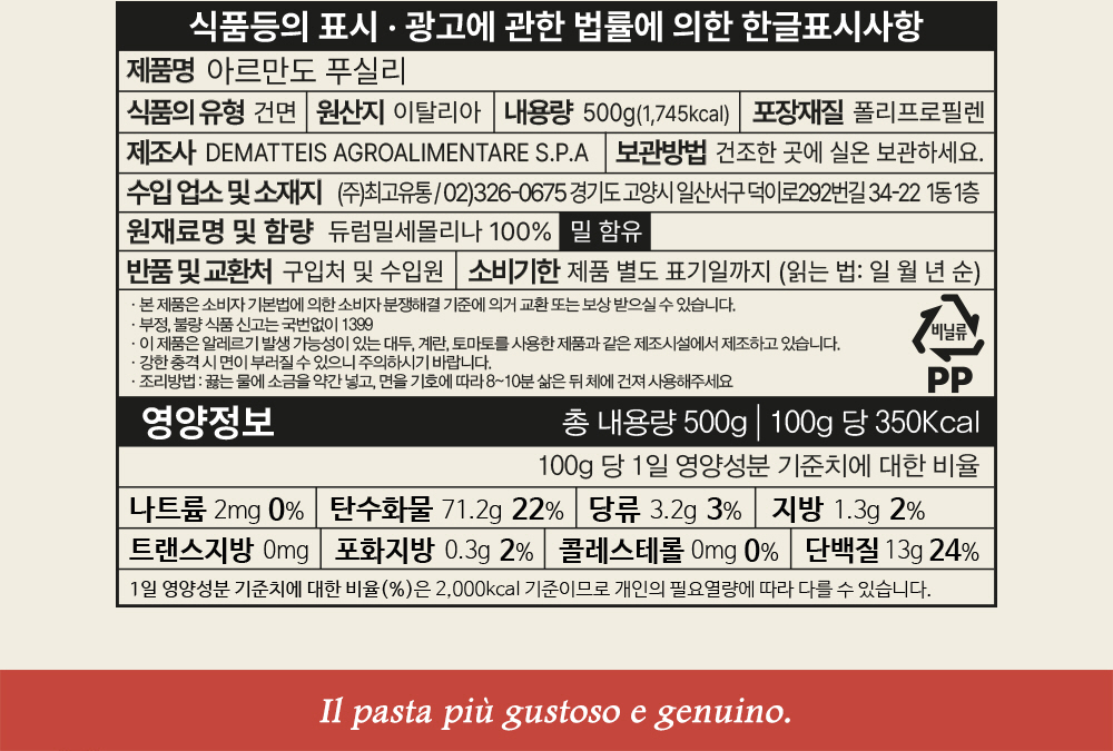 | 생산자 및 소재지/수입자 | 생산자 : DEMATTEIS AGROALIMENTARE S.P.A 소재지 : ㈜최고유통/경기도 고양시 일산서구 덕이로 292번길 34-22, 1동 1층 제조국 : 이탈리아 |