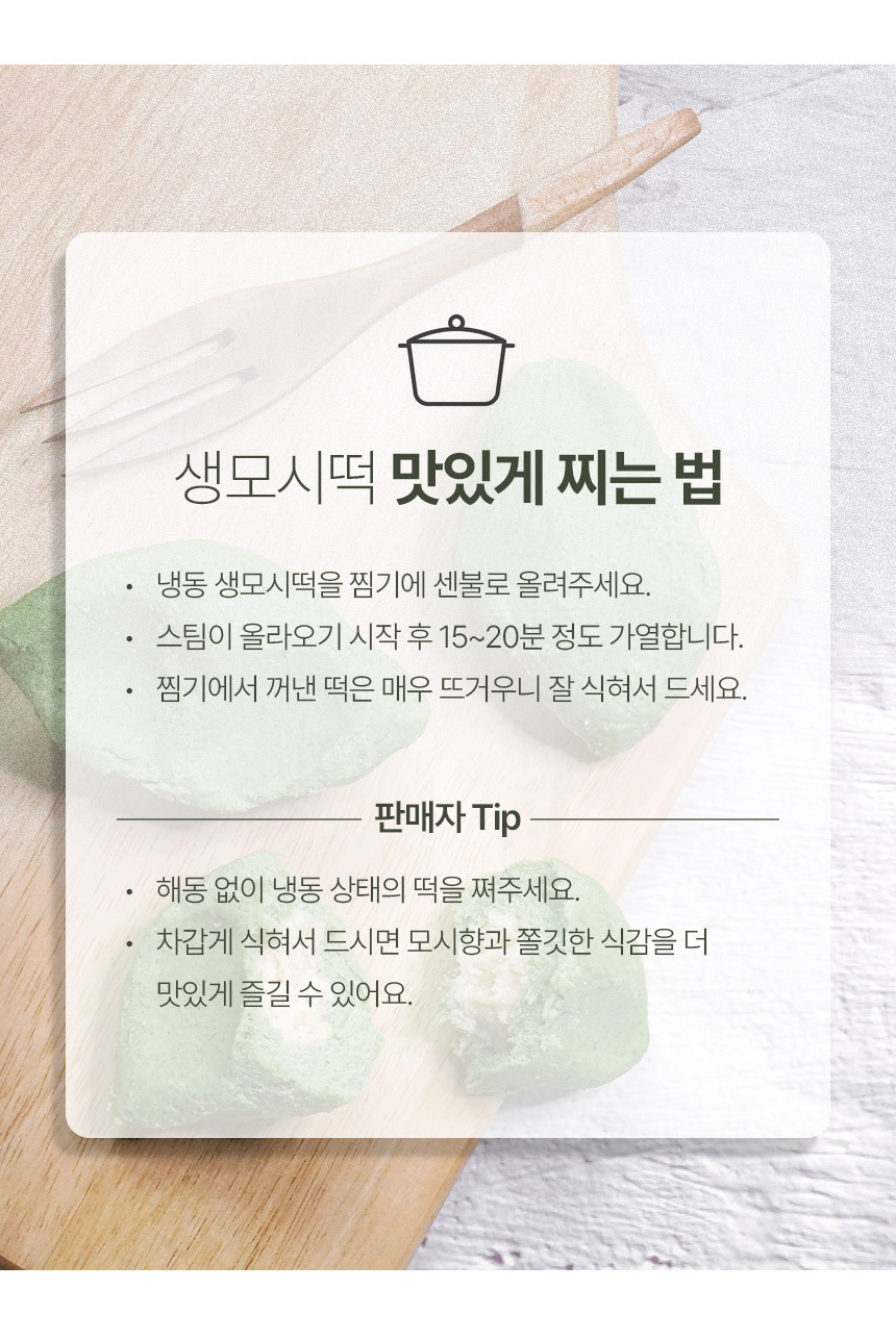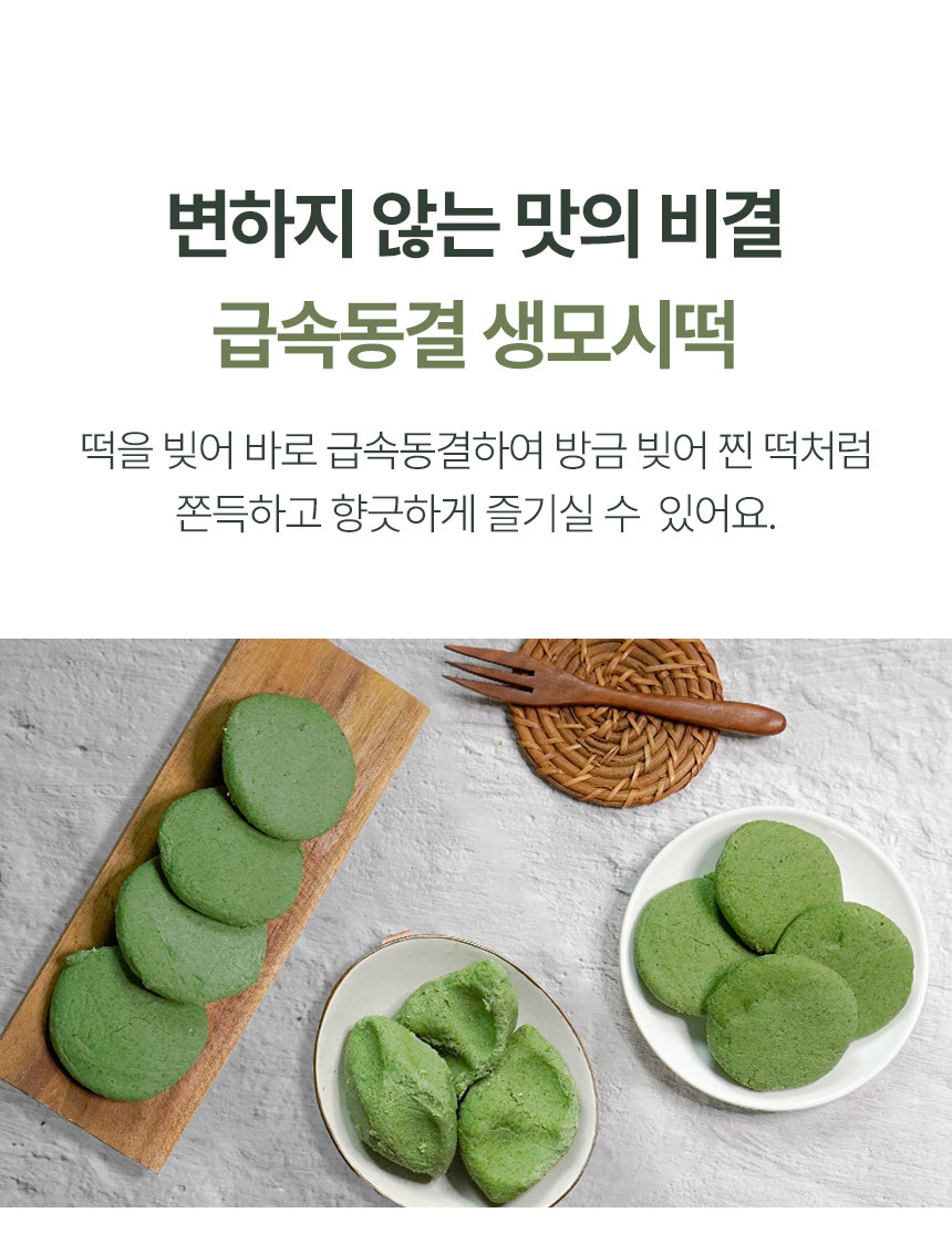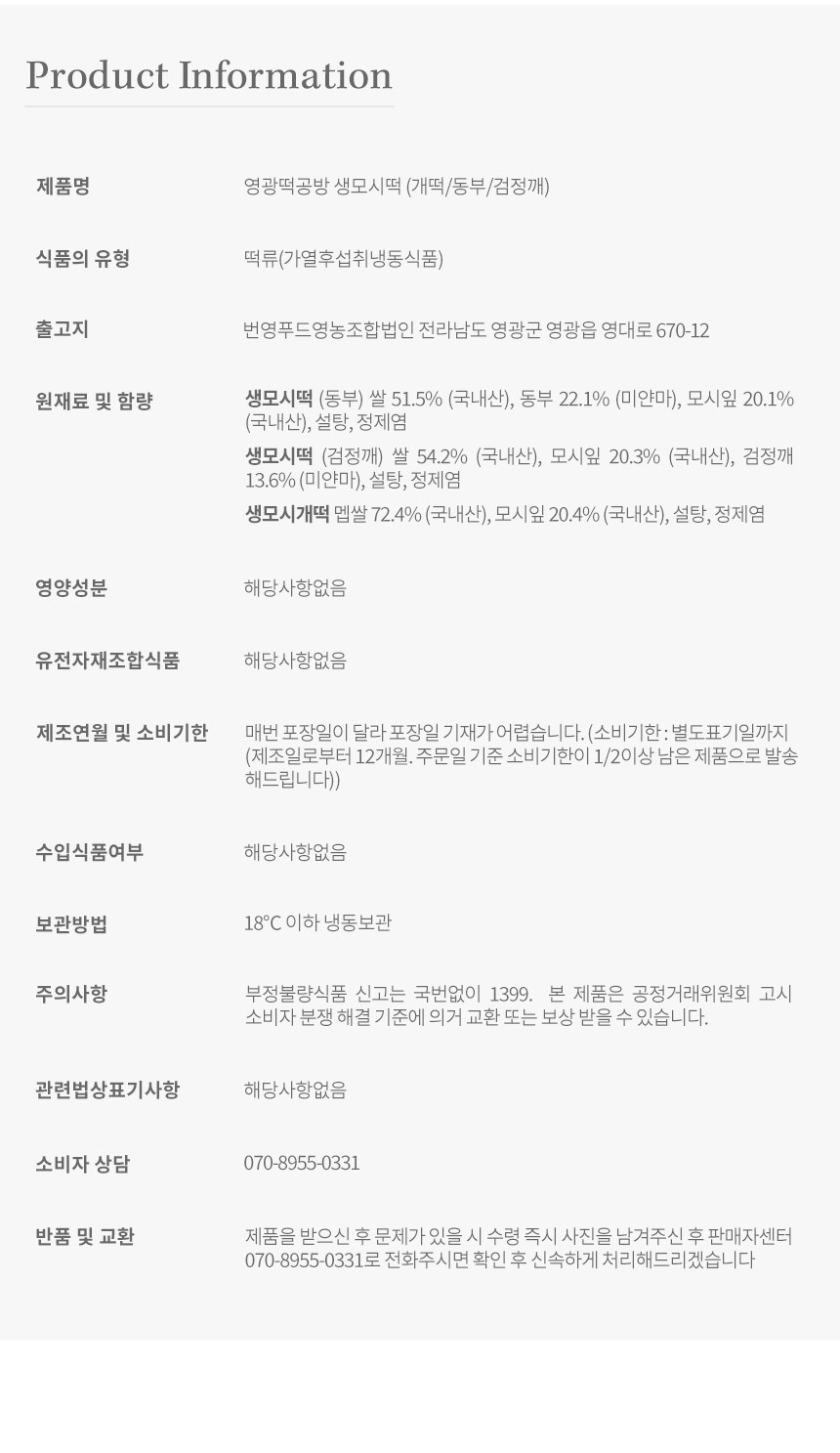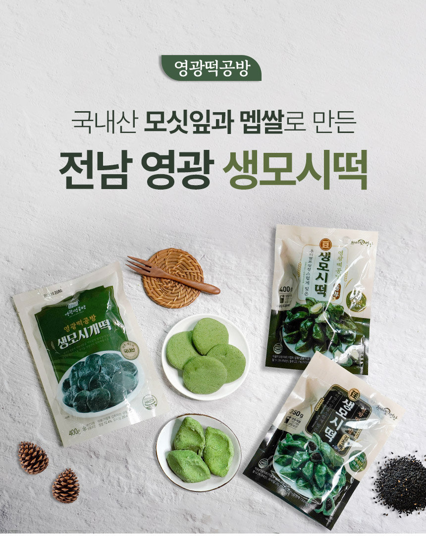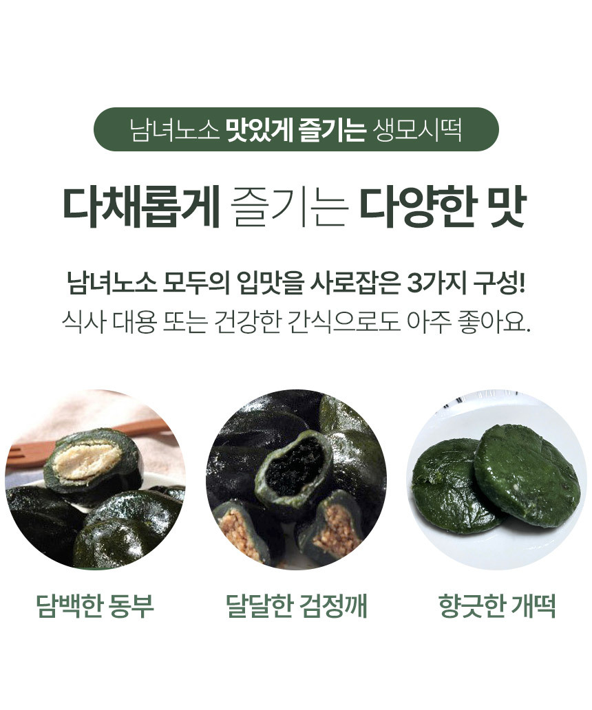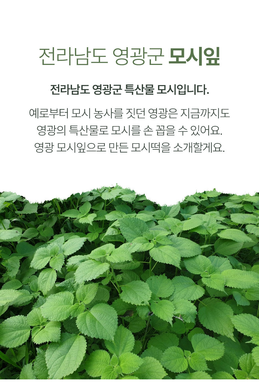| 원재료 및 함량 | 생모시떡 (동부) 쌀 51.5% (국내산), 동부 22.1% (미얀마), 모시잎 20.1% (국내산), 설탕, 정제염 |