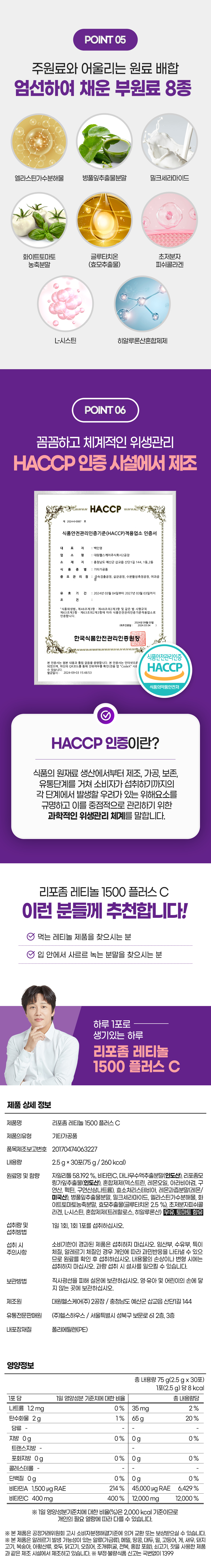 | 원재료 및 함량 | 자일리톨 58.192%, 비타민C, 대나무수액추출분말(인도산), 리포좀모링가잎추출물(인도산), 혼합제제(덱스트린, 레몬오일, 아라비아검, 구연산, 펙틴, 구연산삼나트륨), 효소처리스테비아, 레몬과즙분말(레몬/미국산), 병풀잎추출물분말, 밀크세라마이드, 엘라스틴가수분해물, 화이트토마토농축분말, 효모추출물(글루타치온 2.5 %), 초저분자피쉬콜라겐, L-시스틴, 혼합제제(트레할로스, 히알루론산) 우유, 토마토 함유 |