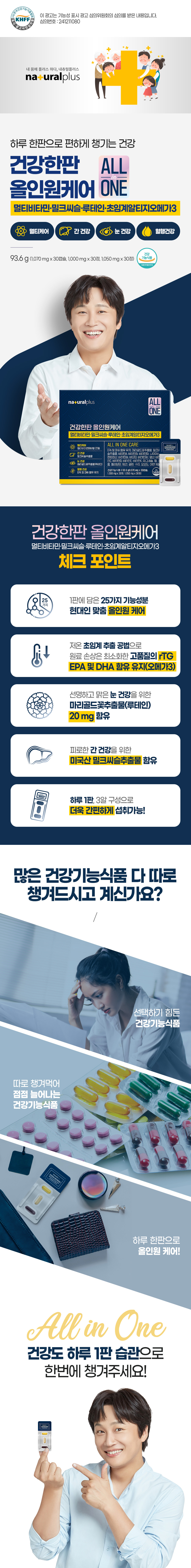| 섭취량, 섭취방법 및 섭취 시 주의사항 및 부작용 가능성 | [섭취량 및 섭취방법] 1일 1회, 1회 1회 분량(연한노란 정제 1, 노란 정제 1, 연질캡슐 1)을 물과 함께 섭취하십시오. [섭취 시 주의사항] 특이체질, 알레르기 체질의 경우에는 간혹 개인에 따라 과민반응을 나타낼 수 있으므로 원료를 확인한 후 섭취하십시오. 소비기한을 확인하시기 바라며, 섭취량 및 섭취방법을 준수 하시기 바랍니다. 의약품(항응고제, 항혈소판제, 혈압강하제 등) 복용 시 전문가와 상담하십시오. 개인에 따라 피부 관련 이상반응이 발생할 수 있습니다. 영·유아, 어린이, 임산부 및 수유부는 섭취를 피하십시오. 흡연자는 섭취 시 전문가와 상담하십시오. 과다 섭취 시 일시적으로 피부가 황색으로 변할 수 있습니다. 고칼슘혈증이 있거나 의약품 복용 시 전문가와 상담하십시오. 특히 6세 이하는 과량섭취하지 않도록 주의하십시오. 당뇨병이 있는 경우 섭취 전 전문가와 상담하십시오. 알레르기 반응이 나타나는 경우에는 섭취 중단하십시오. 설사, 위통, 복부팽만 등의 위장관계 장애가 나타나는 경우에는 섭취에 주의하십시오. 이상사례 발생 시 섭취를 중단하고 전문가와 상담하십시오. |