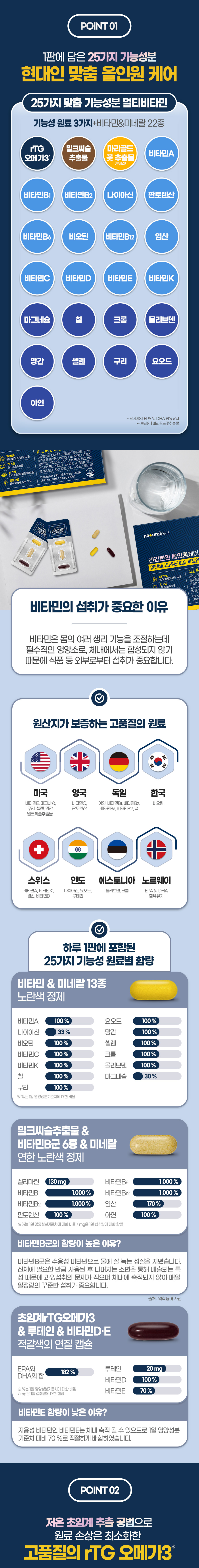 | 원재료 및 함량 | EPA 및 DHA 함유 유지[정제어유, d-토코페롤(혼합형)/노르웨이산], 밀크씨슬추출물분말(미국산), 산화마그네슘, 비타민C, 인산철, 마리골드꽃추출물(인도산), 비타민B12혼합제제(비타민B12, 말토덱스트린, 구연산삼나트륨, 구연산), 비타민B6염산염, 비타민B1염산염, 비타민B2, 건조효모(크롬 함유), 스테아린산마그네슘, 건조효모(몰리브덴 함유), 산화아연, 황산망간, d-a-토코페롤, 비타민A혼합제제(분말비타민A, 포도당시럽분말, 옥수수전분, 아라비아검, 비타민E), 아셀렌산나트륨혼합제제(아셀렌산나트륨, 제이인산칼슘), 판토텐산칼슘,니코틴산아미드, 비오틴혼합제제(비오틴, 제이인산칼슘), 황산동, 비타민K1혼합제제(비타민K1, 아라비아검, 수크로오스), 엽산, 비타민D3혼합제제[비타민D3, 가공유지(팜유), 비타민티], 요오드칼륨, 결정셀룰로스, 히드록시프로필메틸셀룰로스, 정제포도당, 이산화규소, 카복시메틸셀룰로스칼슘, 스테아린산마그네슘, 스테아린산, 레몬오일, 치자황색소, 글리세린지방산에스테르, 이산화티타늄(착색료), 혼합과일농축분말, 베리혼합분말, 세븐베리농축분말,식물혼합추출분말HMS ※ 캡슐기제 : 젤라틴(우피), 정제수, 글리세린, 혼합제제(탄산칼슘,변성전분), 락색소, 안나토색소 대두, 고등어, 쇠고기 함유 |