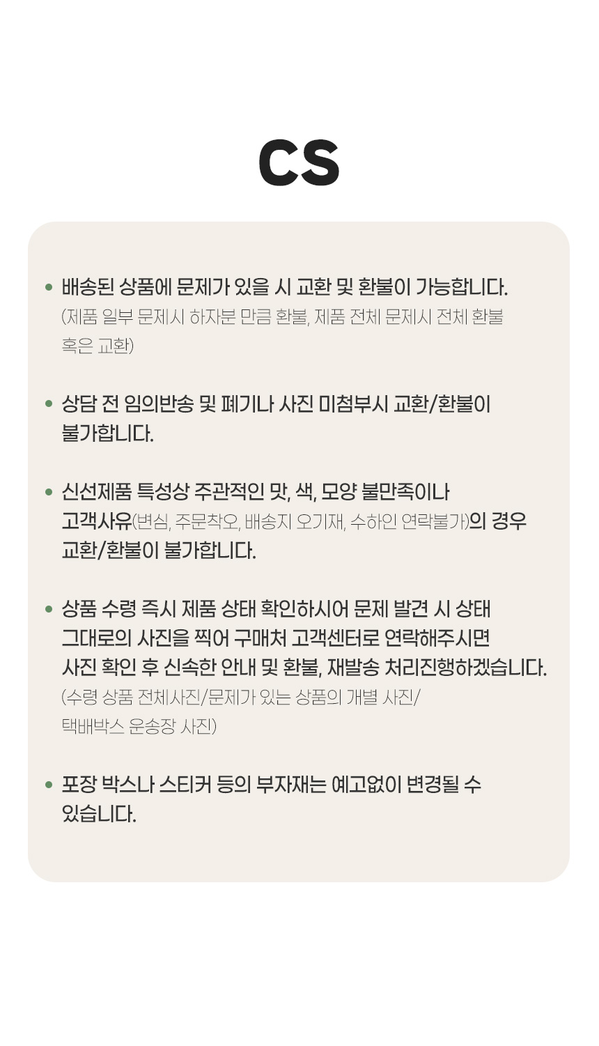| 제조년월일(포장일 또는 생산연도),소비기한 | 포장일자 : 매번 포장일이 달라 포장일 기재가 어렵습니다. 당사(판매원) 고객센터 (02-949-1693)로 문의 바랍니다. / 소비기한 : 신선식품으로 별도의 소비기한이 없어 품질유지기한 기재가 어렵습니다. |