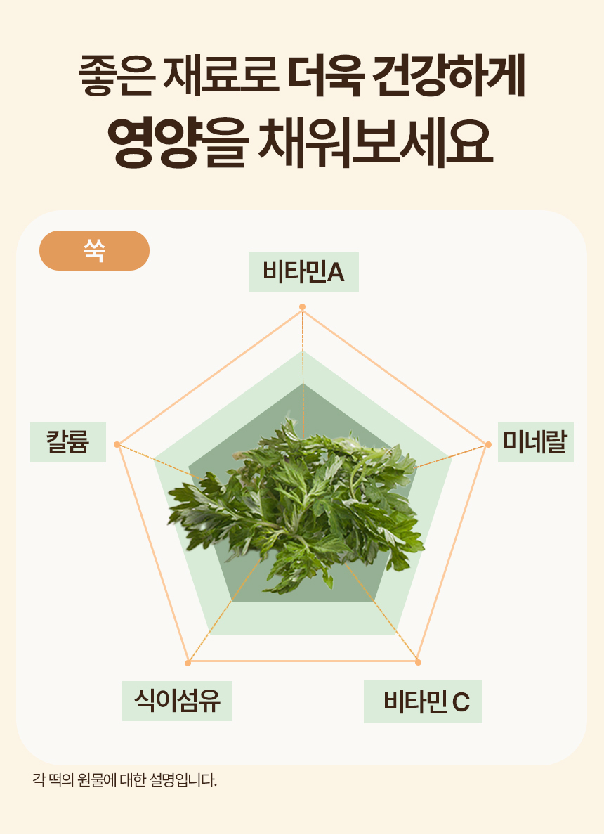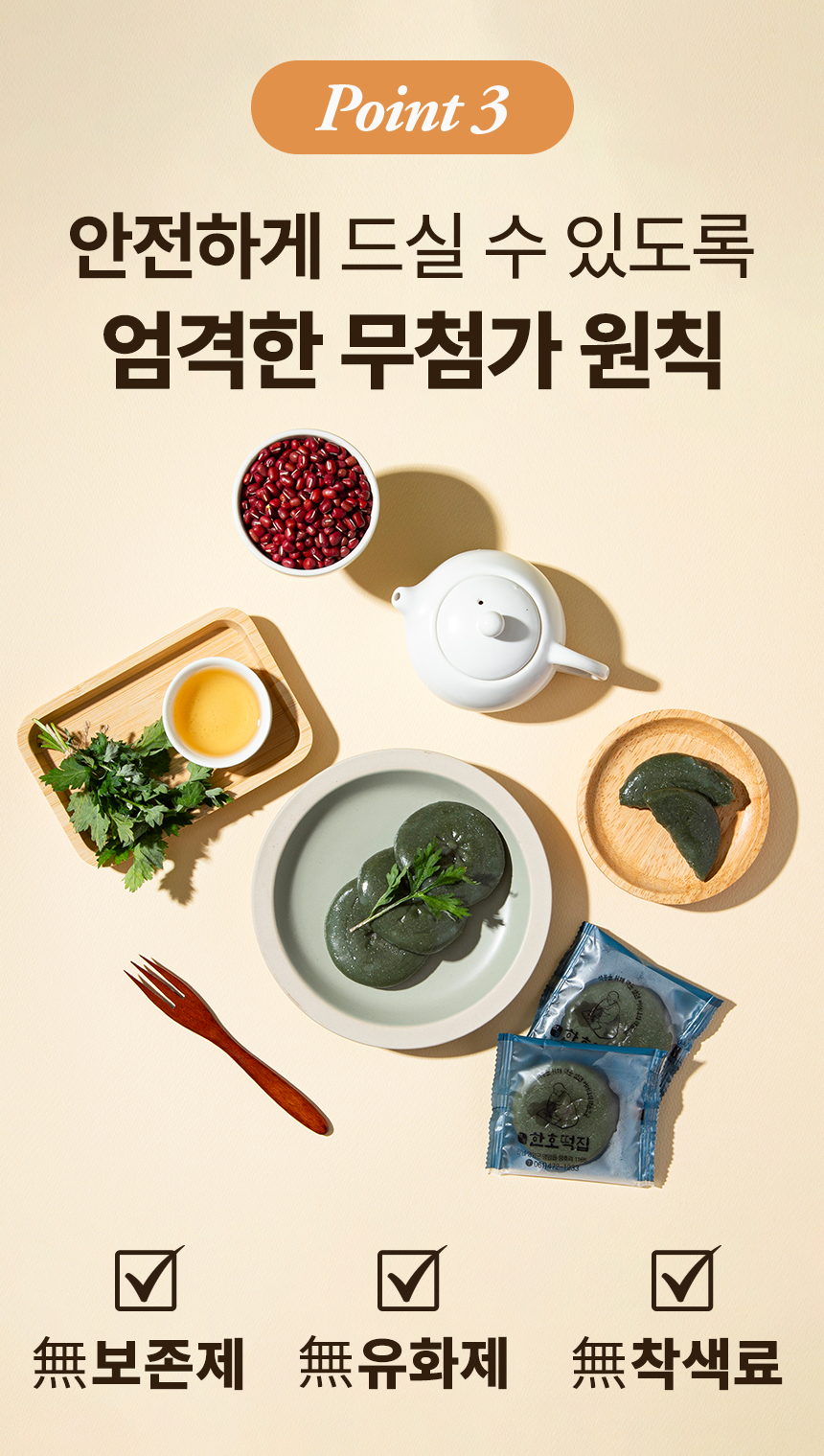 | 원재료 및 함량 | 쌀(국내산), 조림류[통팥앙금{통팥용삶은팥(팥99.8%(중국산), 산도조절제1, 산도조절제2), 설탕, 물엿, 정제소금(국산), 변성전분}], 고운앙금{앙금용삶은팥5(팥99.8%(중국산), 산도조절제1, 산도조절제2), 설탕, 물엿, 정제소금(국산), 변성전분}], 천일염(국산), 참쑥분말(국내산), 찰옥수수전분(외국산), 밀가루(미국산) |