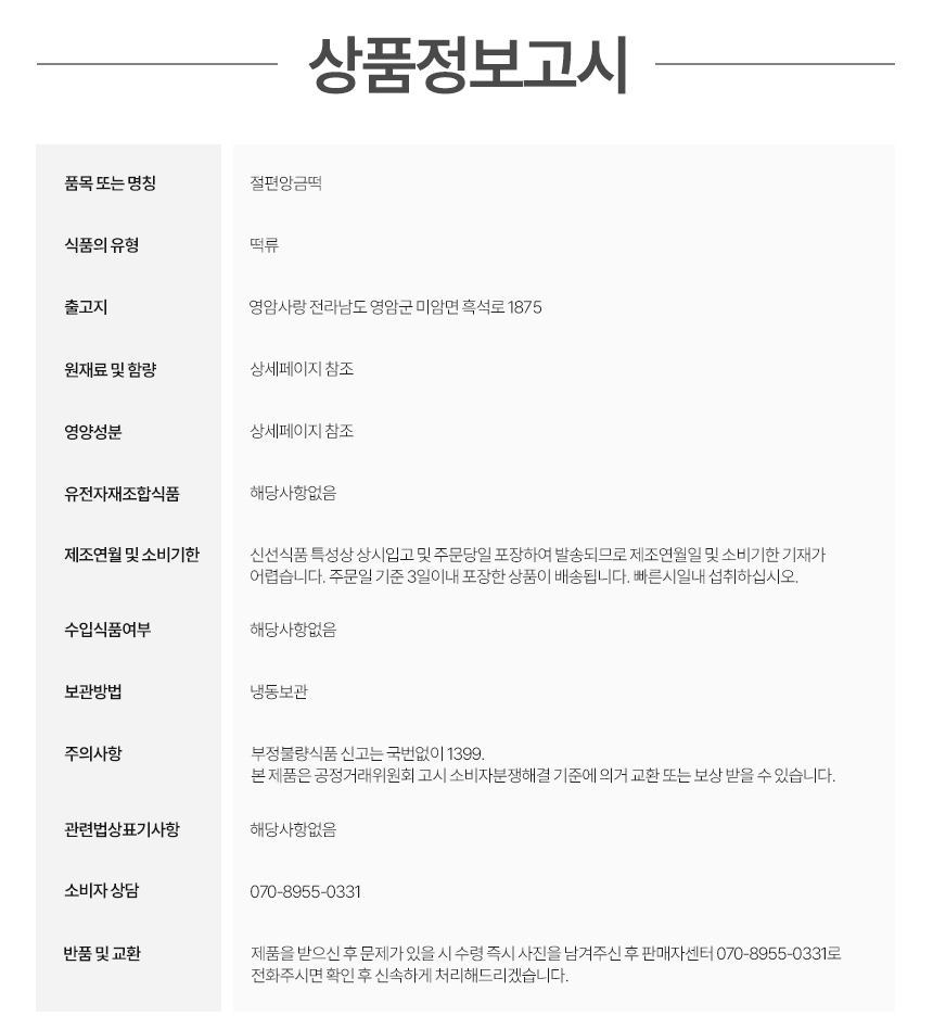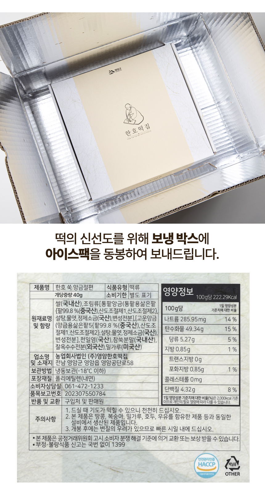 | 생산자 및 소재지/수입자 | 농업회사법인㈜영암한호떡집 전남영암군 영암읍 영암공단로58 |