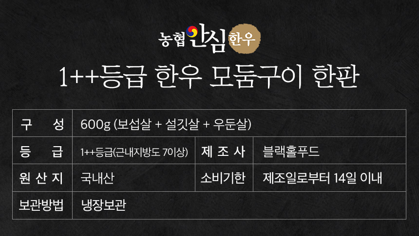 | 상품구성 | 1++등급 보섭살 200g+설깃살200g+우둔살200g/총 600g |