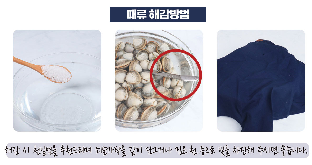 누구나 쉽게 해감 할 수 있으니 수령 후 소금물에 2-3시간 정도 해감해주세요.