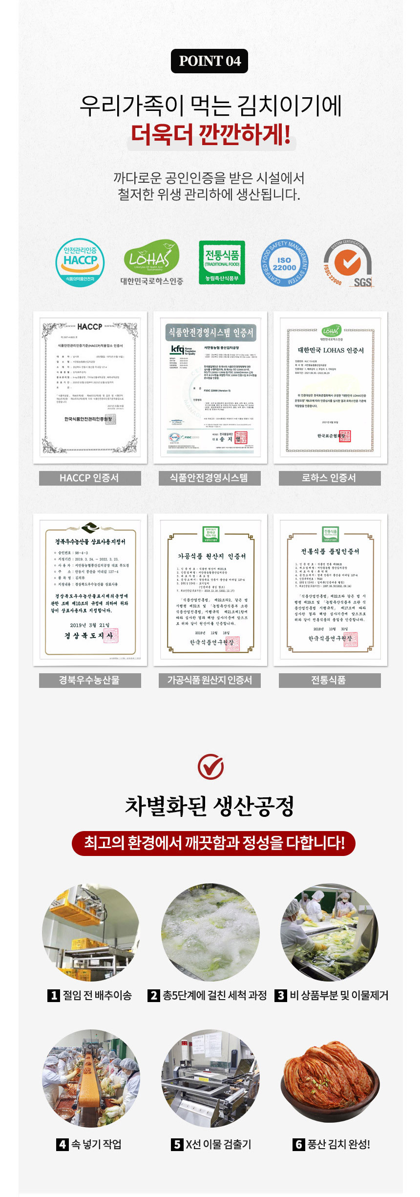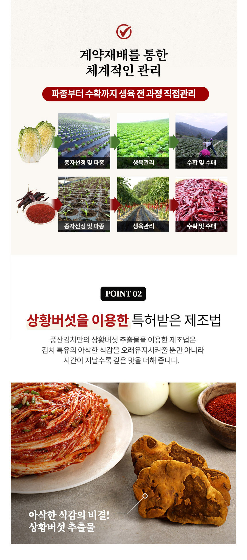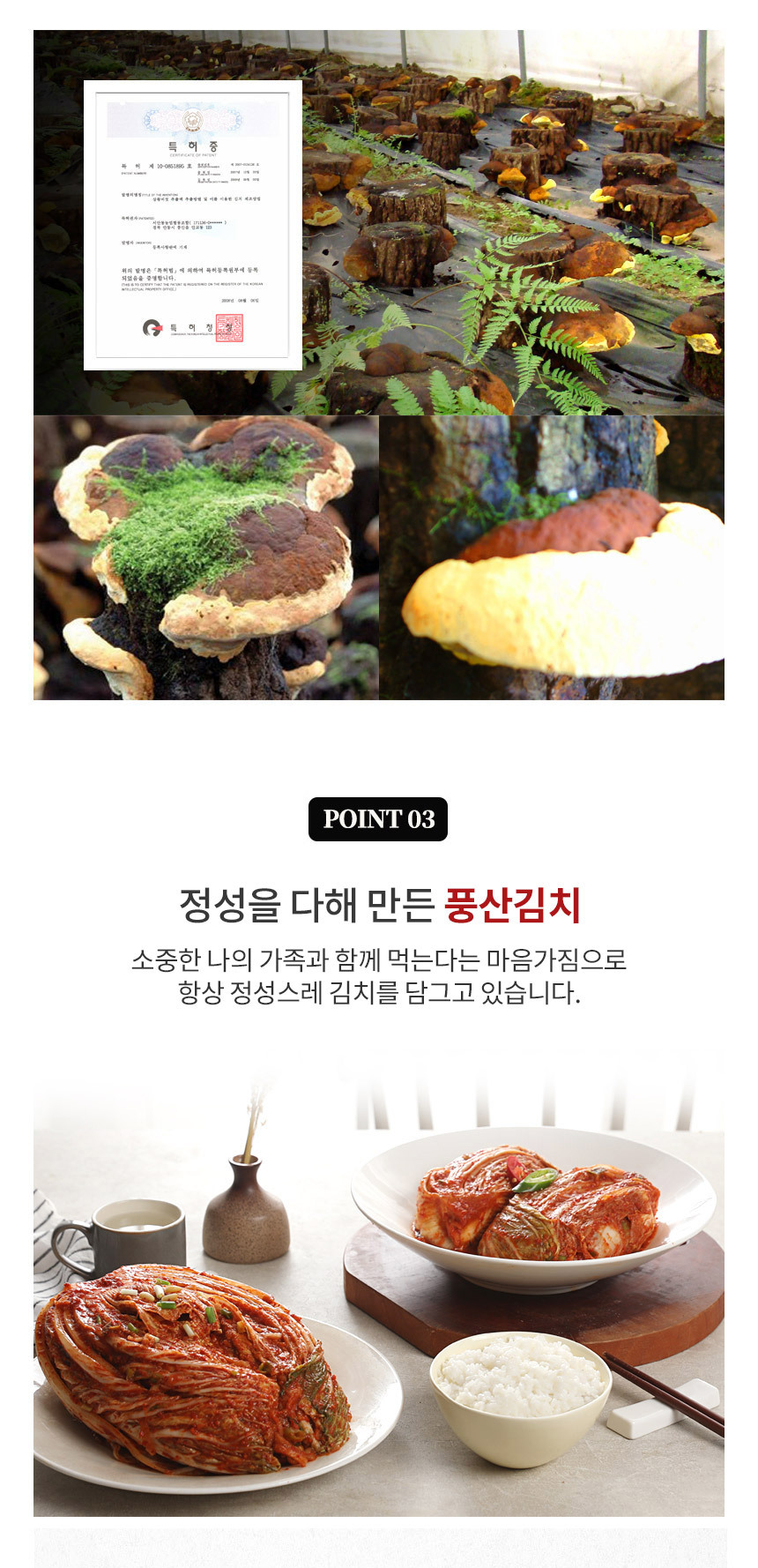 | 원재료 및 함량 | 절임배추 67% [배추 98%국산, 식염(국산)], 무(국산), 쌀풀[쌀, 정제수](국산), 고춧가루(국산), 액젓(멸치, 천일염) (국산), 대파(국산), 마늘(국산), 염장새우(새우, 천일염)(국산), 생강(국산), 설탕, 진흙버섯자실체추출액 [목질진흙상황버섯추출액](국산), 표고버섯(국산) |