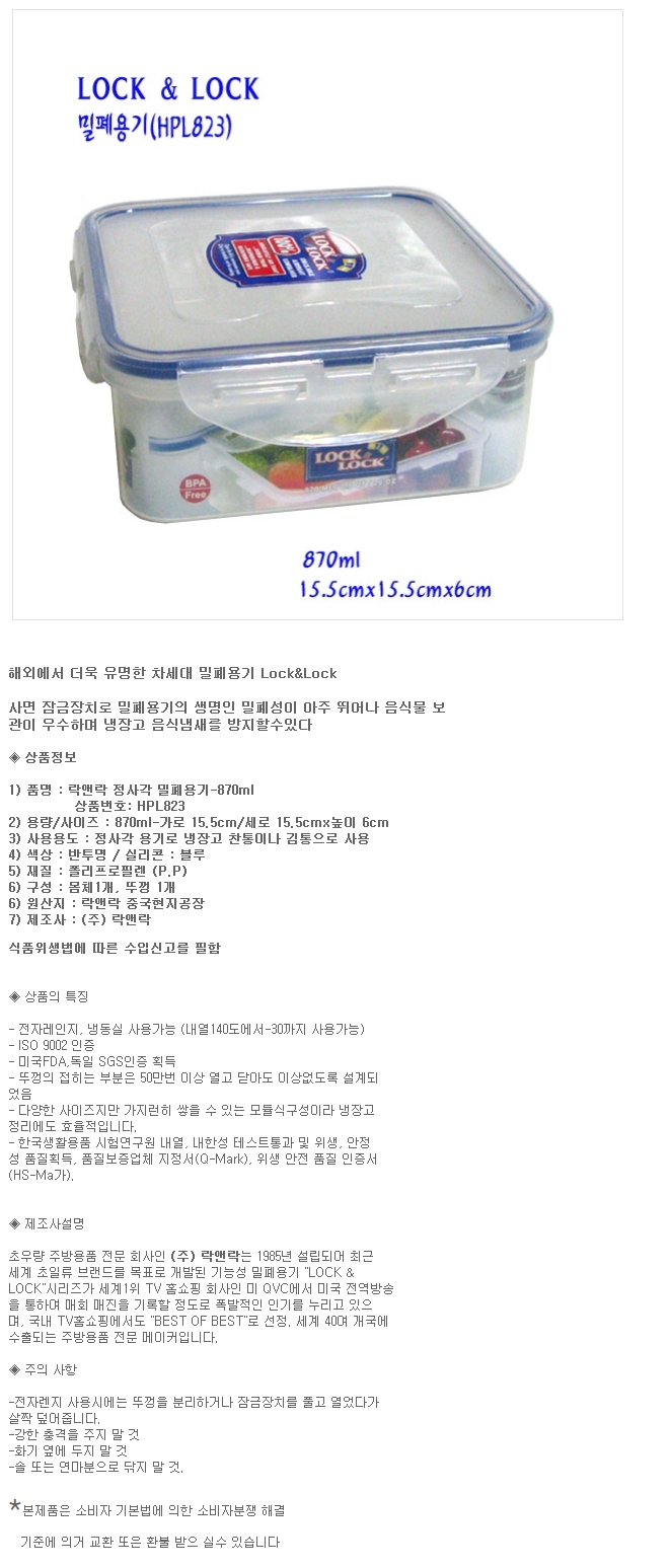 | 상품명:락앤락 밀폐용기 반찬통 냉장고 용기 정사각 870ml |