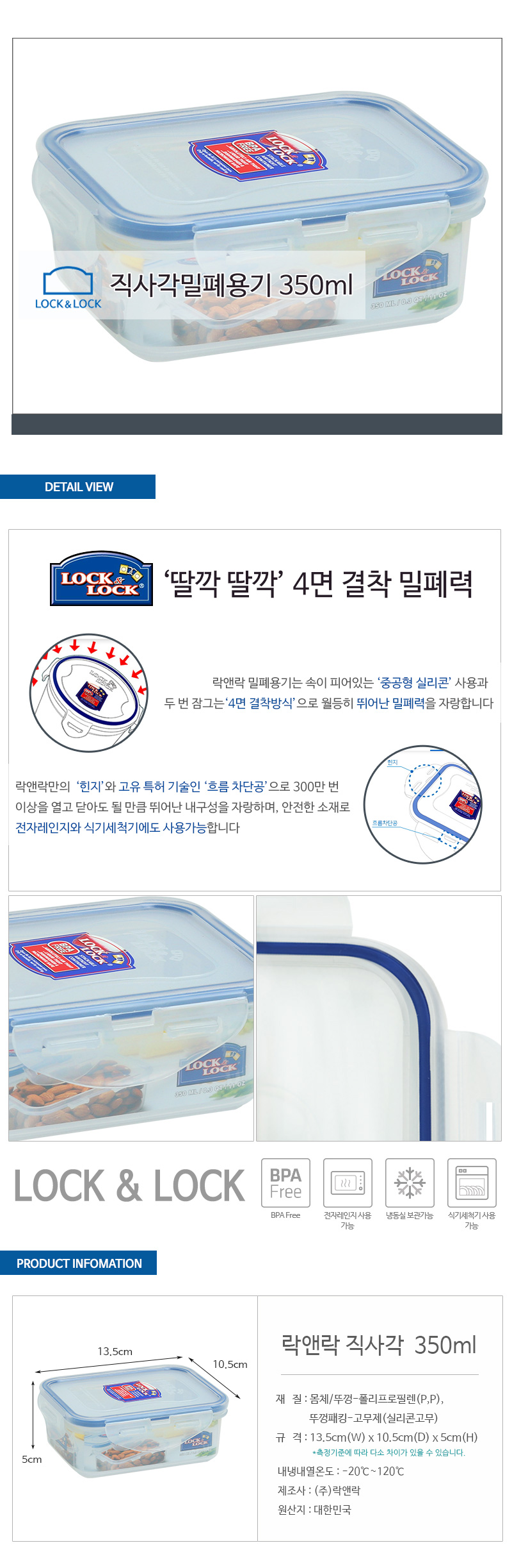 | 품명 및 모델명 | 락앤락 클래식 반찬통 350ml 직사각 소분용 / 상세정보별도표시 |