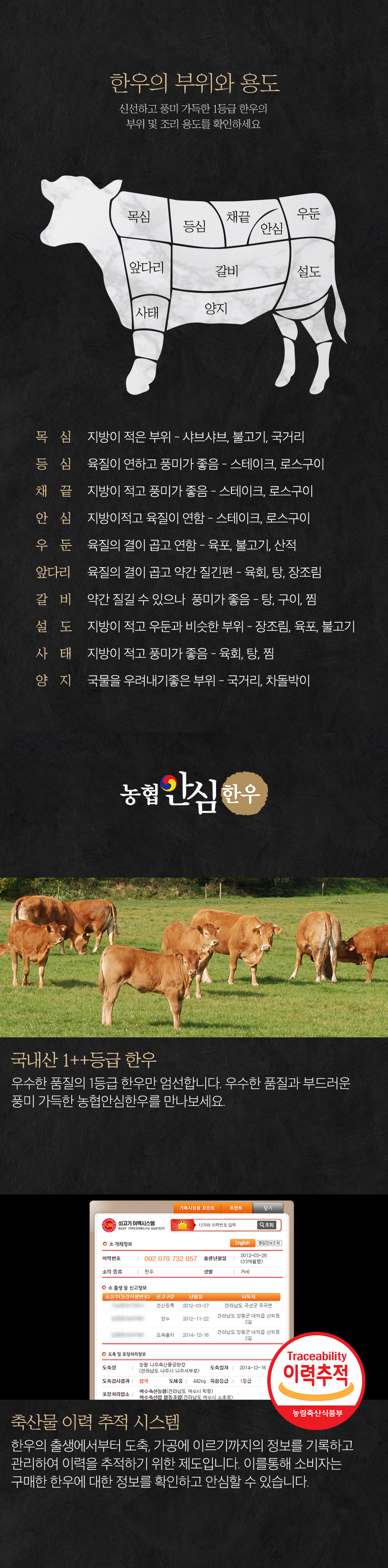 | 관련법상 표시사항 | 축산법에 따른 등급 표시 1++등급(7이상)/ 쇠고기 이력 추적시스템 / HACCP 인증/이력번호 표시제품으로 수령하는 고객님들이 직접 이력번호를 확인할 수 있음 |