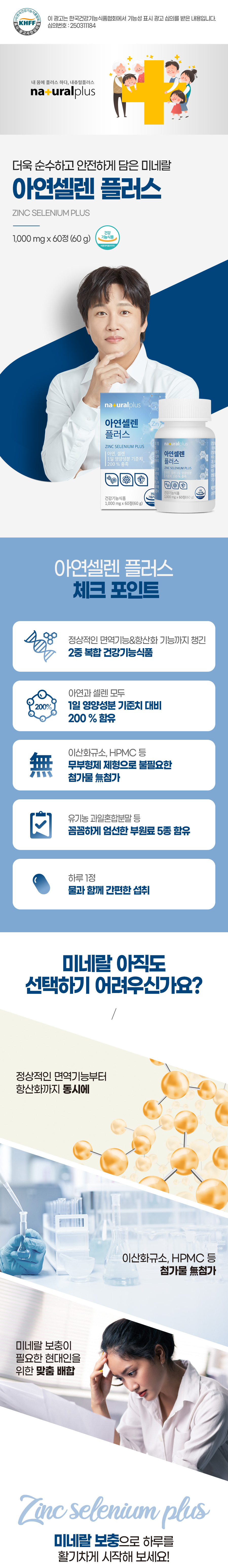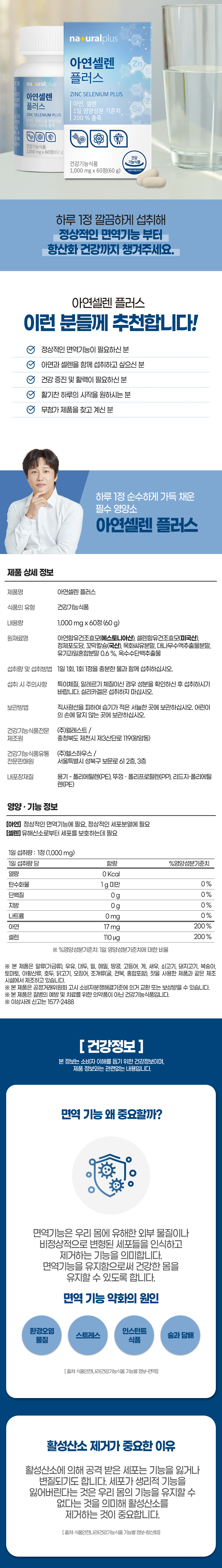 | 기능정보 | [아연] 정상적인 면역기능에 필요, 정상적인 세포분열에 필요 [셀렌] 유해산소로부터 세포를 보호하는데 필요 |
