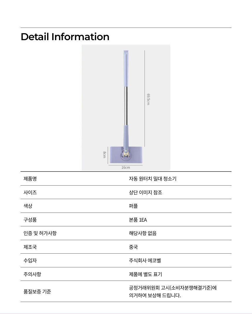 | 품명 및 모델명 | 자동 원터치 밀대 청소기 / ECLICLRO60_E |