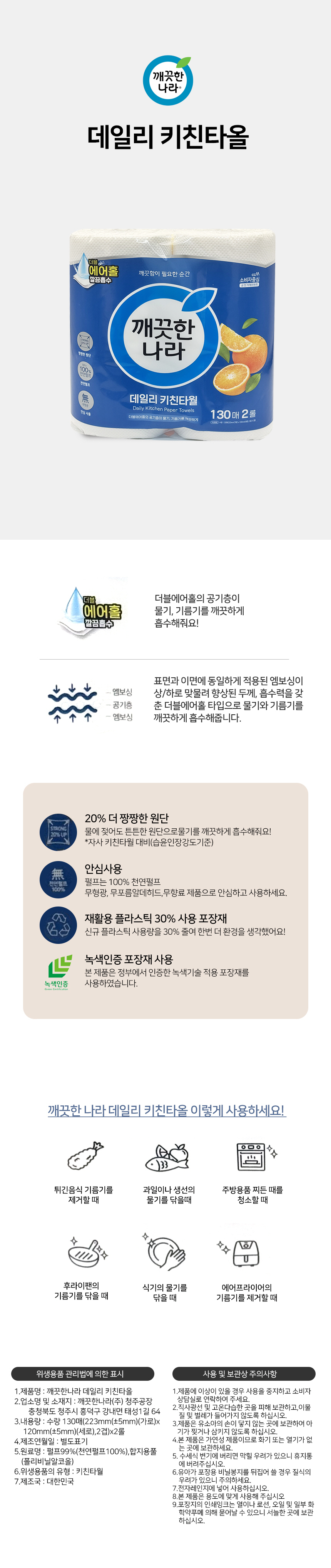| 품명 및 모델명 | 깨끗한나라 기름기제거 데일리 키친타올 130매 2롤 / 상세정보별도표시 |