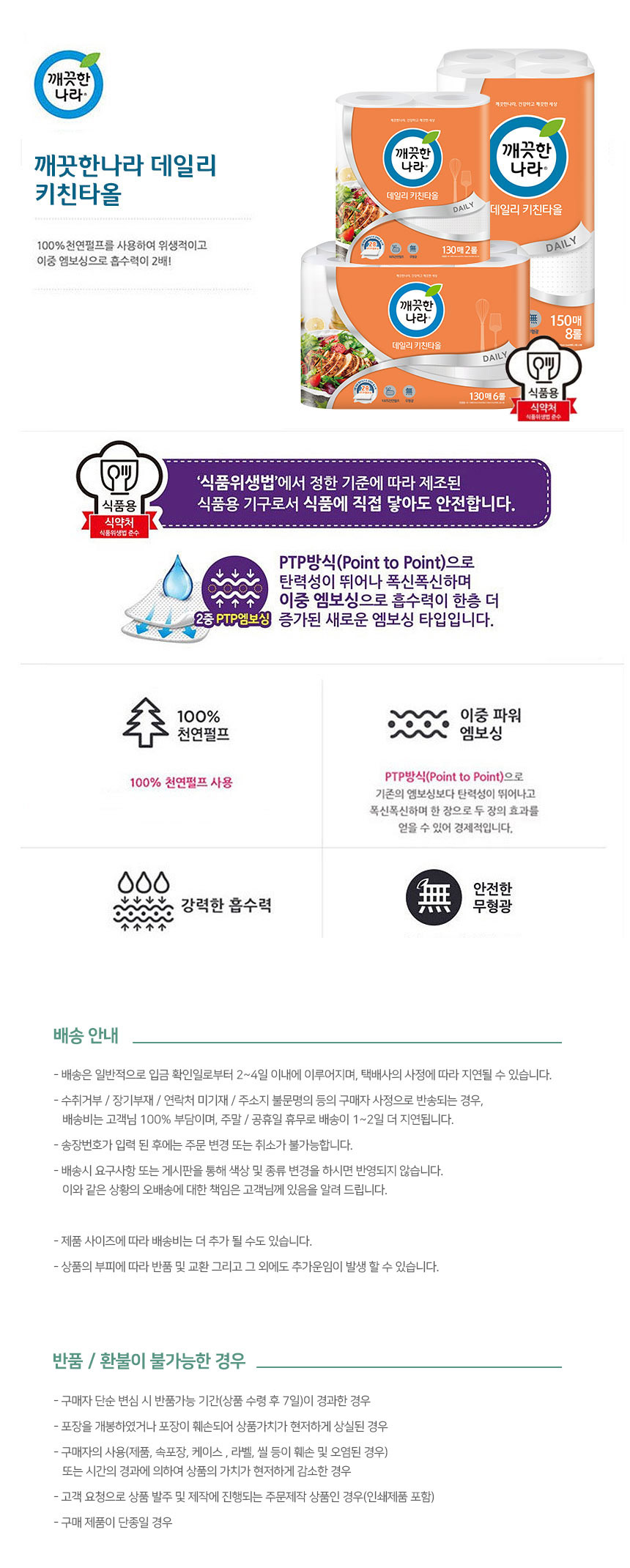 | 품명 및 모델명 | 데일리 키친타올 깨끗한 나라 이중엠보싱 130매 2롤 / 상세정보별도표시 |