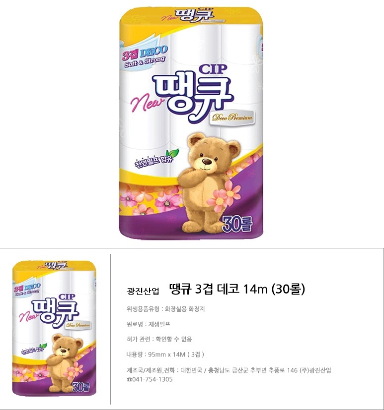 | 품명 및 모델명 | 롤화장지 땡큐 데코 프리미엄 화장지 3겹 14m (30롤) / 상세정보별도표시 |