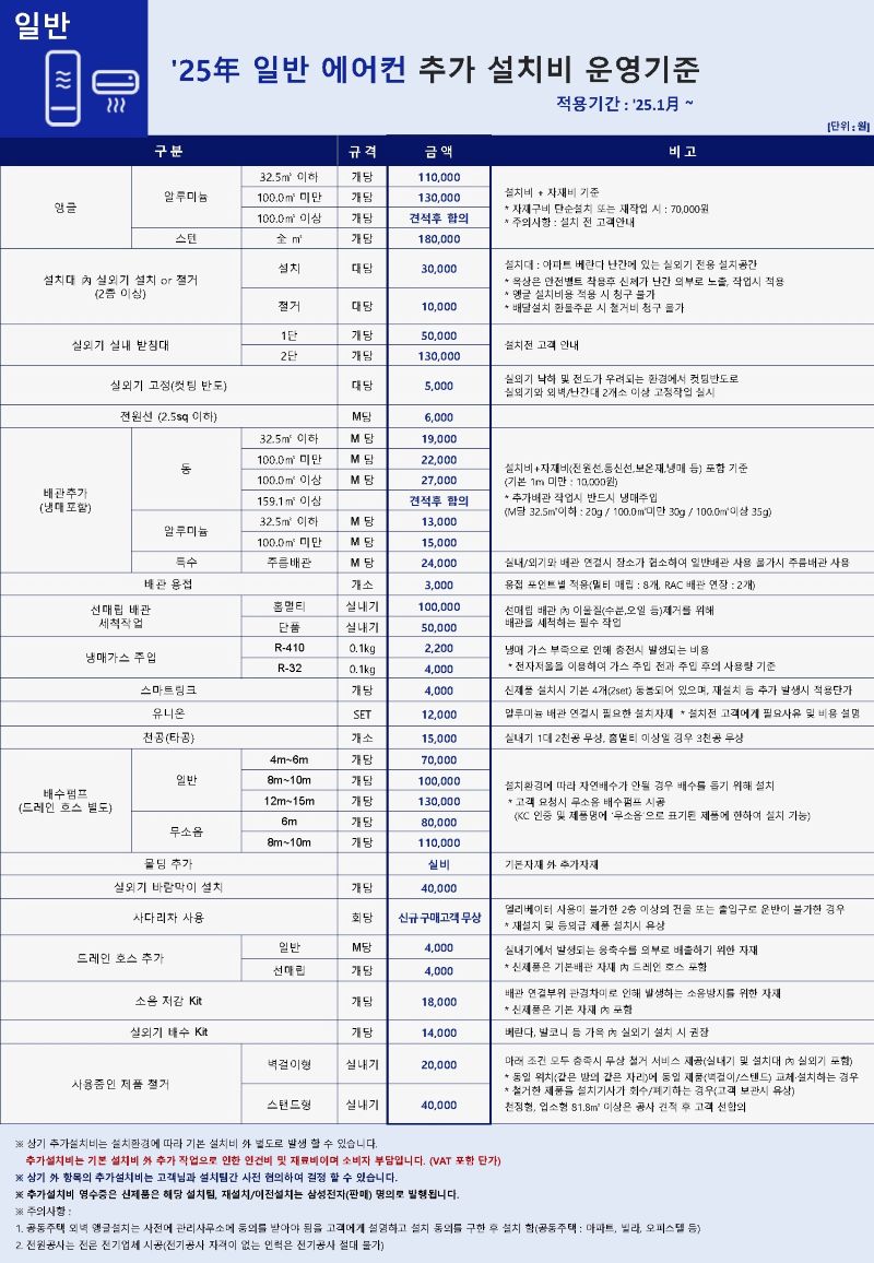 다만 현장에서 앵글이나 배관 추가 시 추가 설치비 발생할 수 있는 점 참고 바랍니다.