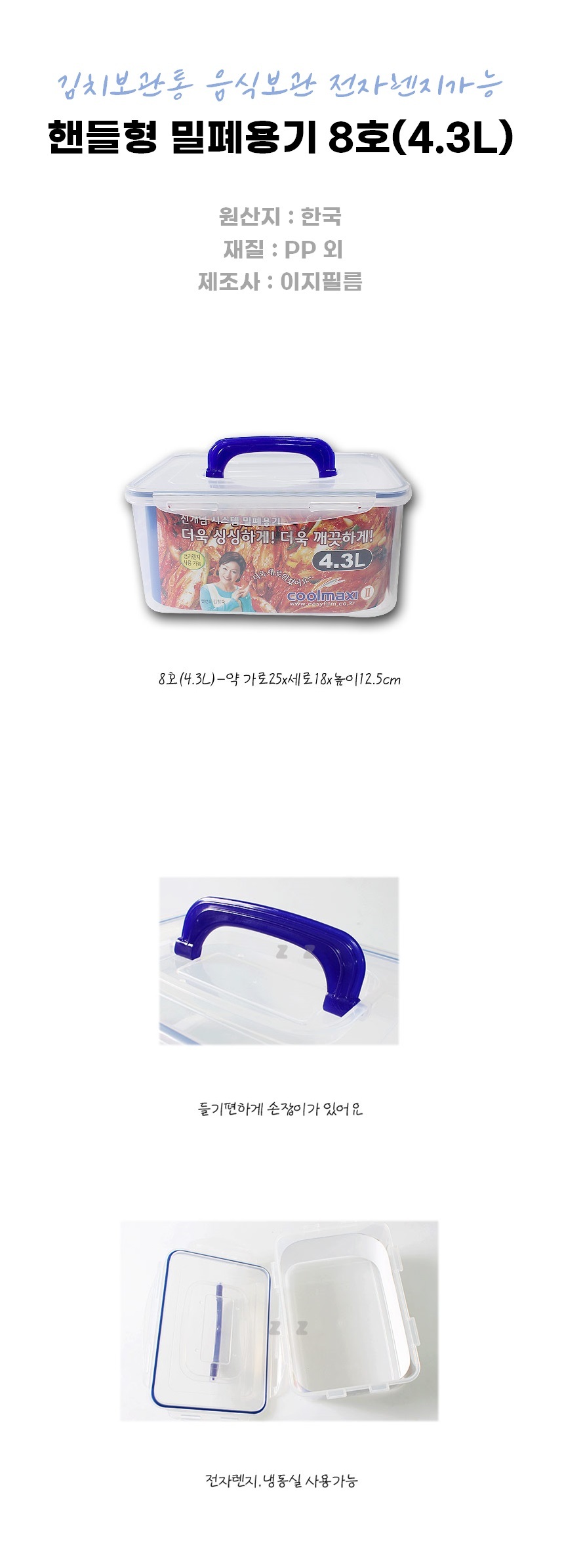 | 품명 및 모델명 | 핸들형 직사각 밀폐통 8호 4.3L 김치보관통 / 상세정보별도표시 |